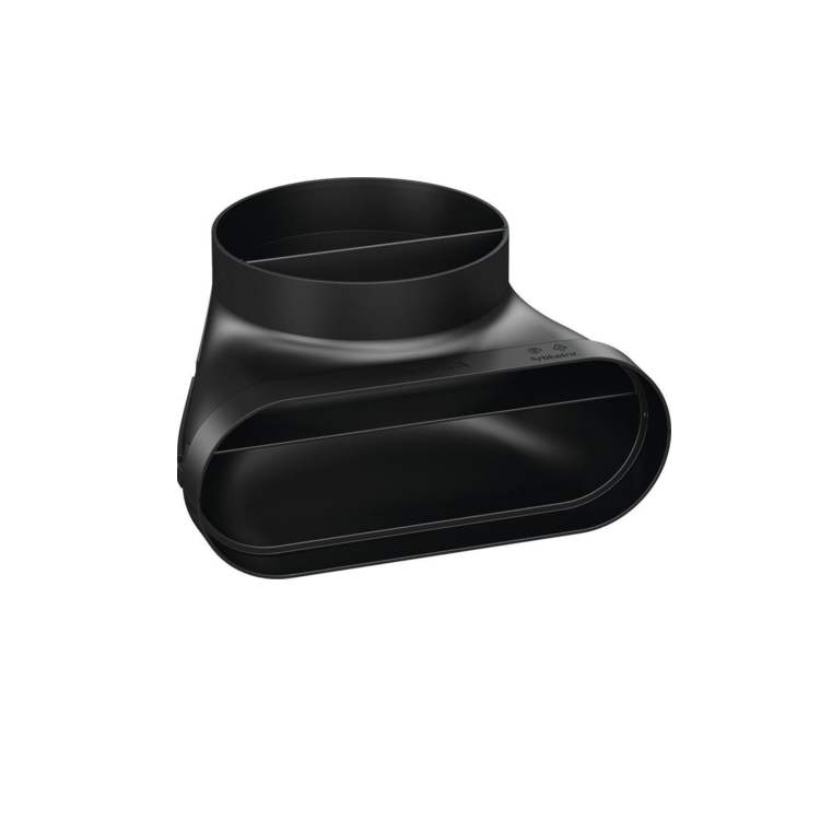 Угол в 90° обеспечивает плавный переход между плоским и круглым сечением. За счет оптимизированной геометрии снижается турбулентность воздуха, что уменьшает уровень шума при работе. Плотное стыковочное соединение предотвращает утечки и помогает поддерживать тягу на заданном уровне. Такая конструкция сохраняет пропускную способность канала и повышает эффективность отвода воздуха. Монтаж прост и не требует специальных инструментов.
