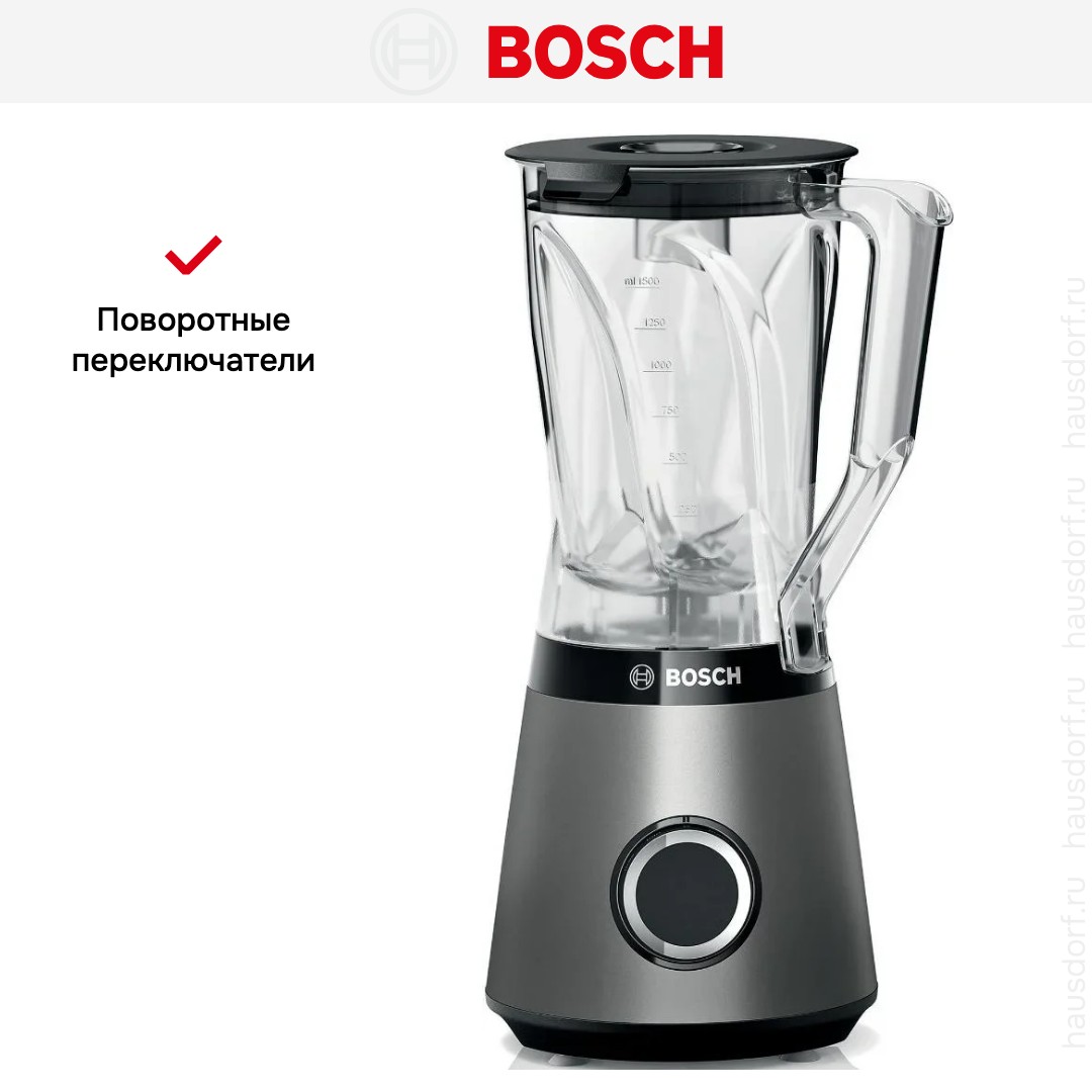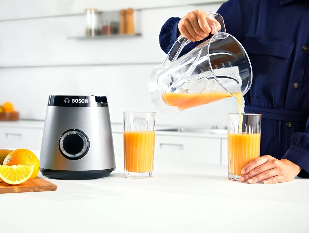 Стационарный блендер Bosch позволяет готовить смузи, коктейли, смешивать соусы и заправки, измельчать продукты до состояния пюре и многое другое. Его конструкция подразумевает автономную работу — вам нужно только положить овощи или фрукты и выбрать режим. Корпус сделан в основном из пластика, что уменьшает вес прибора. Он может как влиться в общую гамму интерьера, так и стать ярким акцентом; доминирующий цвет — серебристый. Благодаря специальным нескользящим ножкам блендер сохраняет устойчивость даже на высоких оборотах.