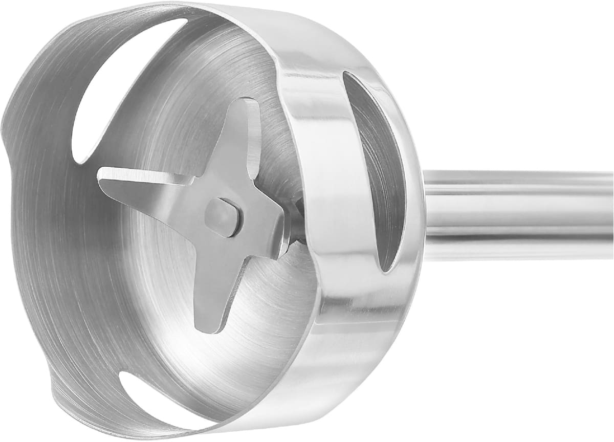 Погружной — мотор расположен в рукоятке, на конце которой есть насадка с венчиком или ножами. Вы опускаете ее в емкость и измельчаете продукты, удерживая прибор на месте, нажимая или проводя по кругу.
