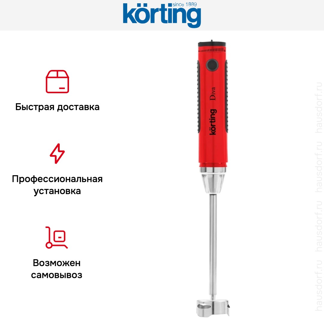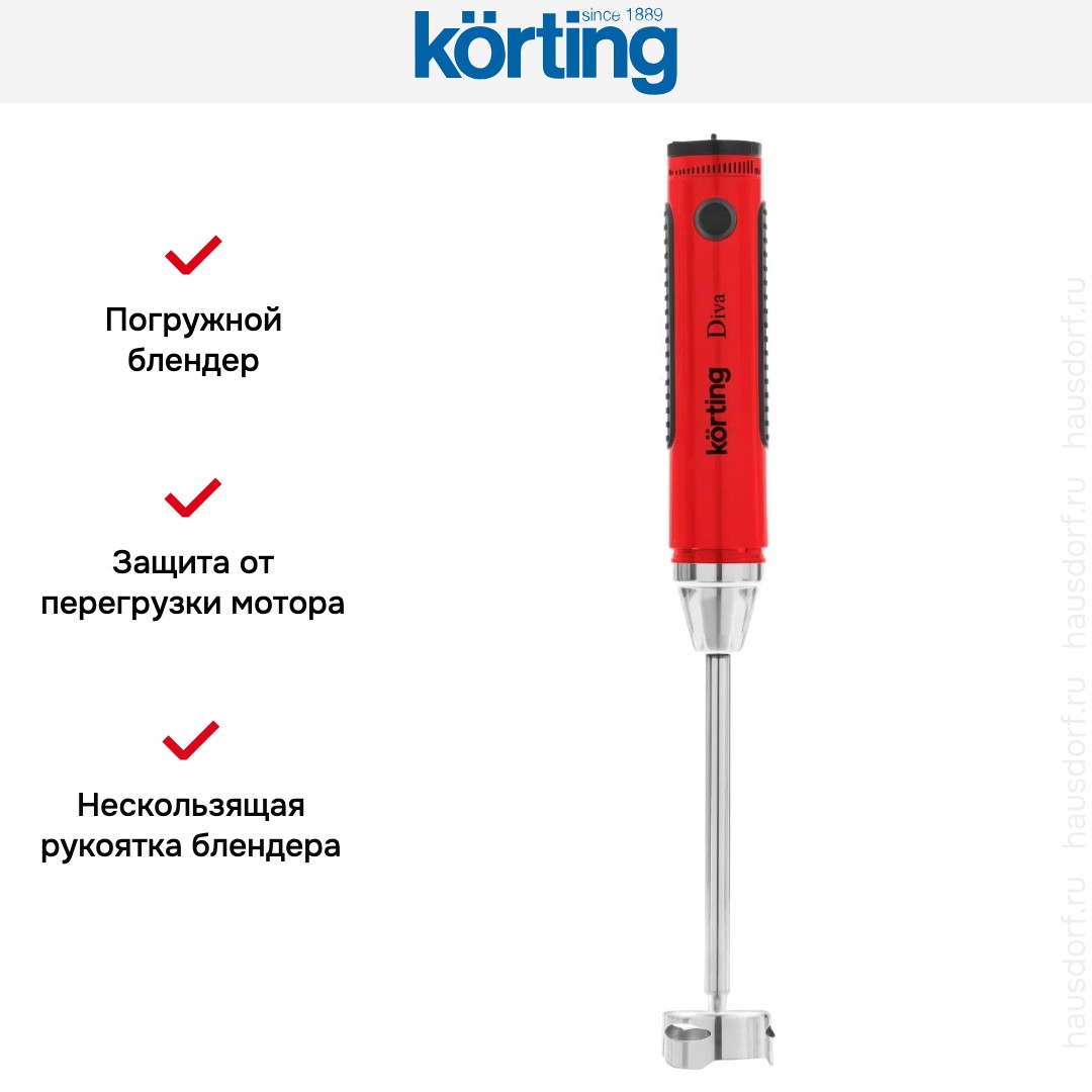 Погружной блендер Korting позволяет готовить смузи, коктейли, смешивать соусы и заправки и многое другое. Такая конструкция требует вашего участия — нужно держать рукоятку с насадкой и контролировать направление движения. Плюс в том, что можно использовать ее прямо в кастрюле, когда готовите, например, суп-пюре. Корпус сделан в основном из пластика, что уменьшает вес прибора. Он может как влиться в общую гамму интерьера, так и стать ярким акцентом; доминирующий цвет — красный. Отдельная особенность этой модели — крепление на стену, которое позволяет сэкономить место на кухне и грамотно распределить технику.