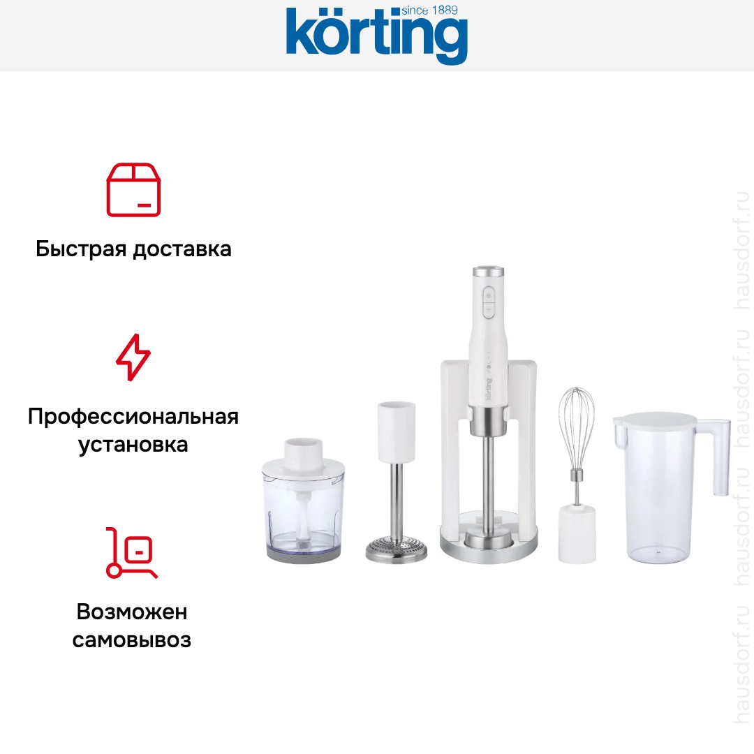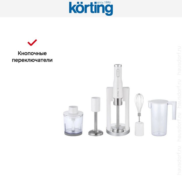 Погружной блендер Korting позволяет готовить смузи, коктейли, смешивать соусы и заправки и многое другое. Такая конструкция требует вашего участия — нужно держать рукоятку с насадкой и контролировать направление движения. Плюс в том, что можно использовать ее прямо в кастрюле, когда готовите, например, суп-пюре. Он может как влиться в общую гамму интерьера, так и стать ярким акцентом; доминирующий цвет — белый.