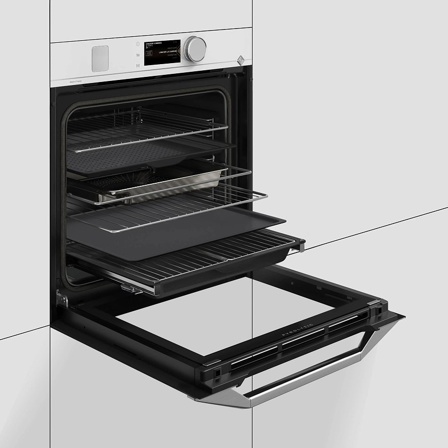 Объем 73 литра и шесть уровней приготовления дают пространство для больших блюд и одновременной готовки на нескольких уровнях. Хромированные и телескопические направляющие полного выдвижения гарантируют безопасное извлечение противней, а в комплект входят решетки и разные типы противней, включая перфорированный стальной. Резервуар для воды объемом 1 литр с индикатором уровня упрощает использование паровых режимов без частого вмешательства.