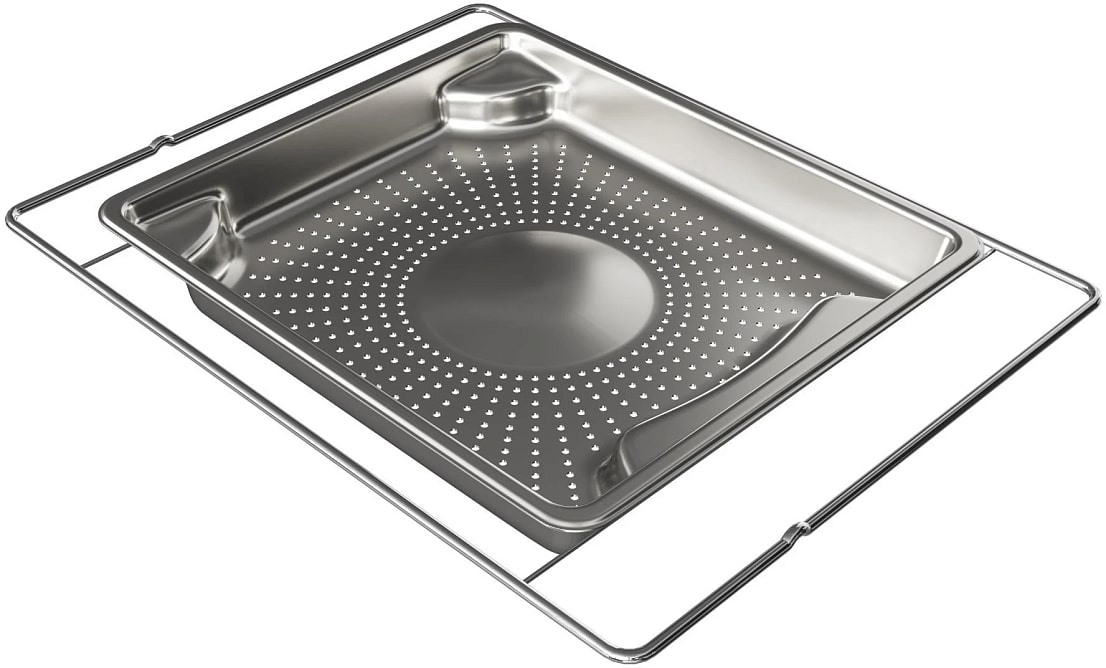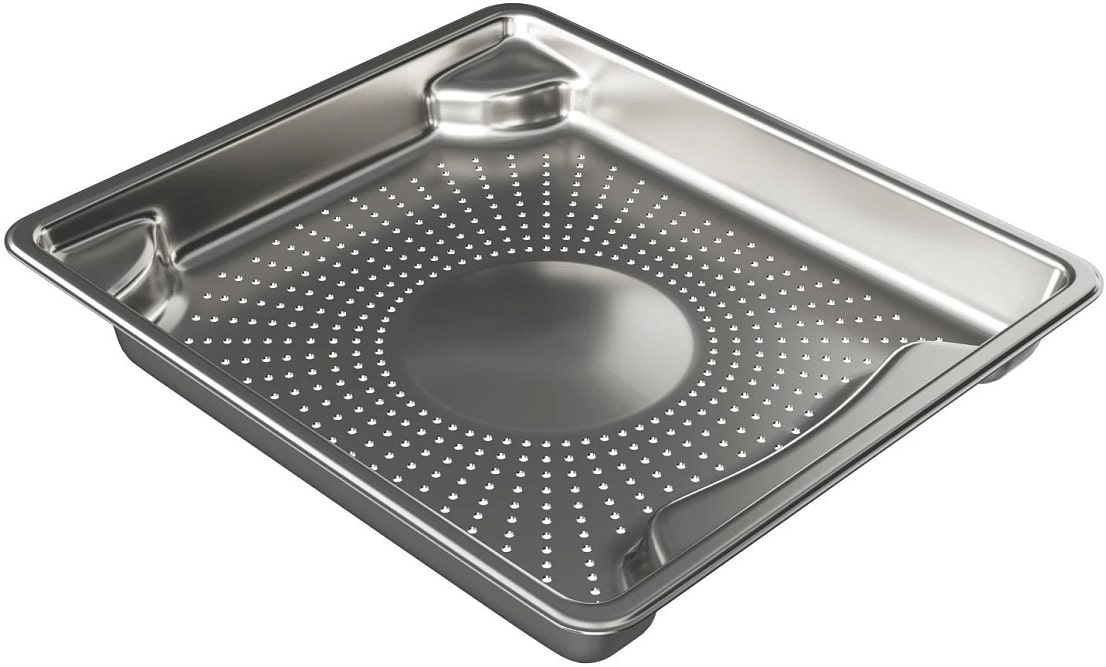 В стандартную комплектацию любого духового шкафа входят один или два противня — эмалированных или с антипригарным покрытием — и решетка. Единственный противень, как правило, имеет низкие бортики и предназначается для приготовления выпечки. Если духовка комплектуется двумя противнями, то второй отличается более высокими бортиками — его можно использовать для запекания мяса, птицы, овощных блюд. На решетке в духовке, не оснащенной грилем, обычно устанавливаются формы для запекания — стальные, керамические или стеклянные. В духовках премиум-класса количество противней может быть увеличено: к стандартному комплекту добавляются противни с перфорацией для мяса, специальные поддоны для сбора выделившегося сока.