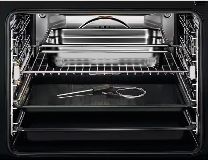Термощуп в духовых шкафах Electrolux — это электронный термометр, который способен определить температуру внутри готовящихся блюд. Острый конец термощупа с температурным датчиком, температура измеряется непрерывно, а по достижении заданного значения духовка отключается автоматически.