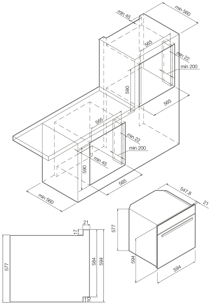 При установке духового шкафа в тумбу необходим также зазор между прибором и полом не менее 8–10 см. Если же она устанавливается в колонну, следует убедиться, что при открывании дверцы в лицо не будет ударять горячий воздух, а панель управления легко доступна. Кроме того, необходимо обеспечить свободный доступ ко всем розеткам и кабелям — они не должны размещаться непосредственно за задней стенкой духового шкафа.