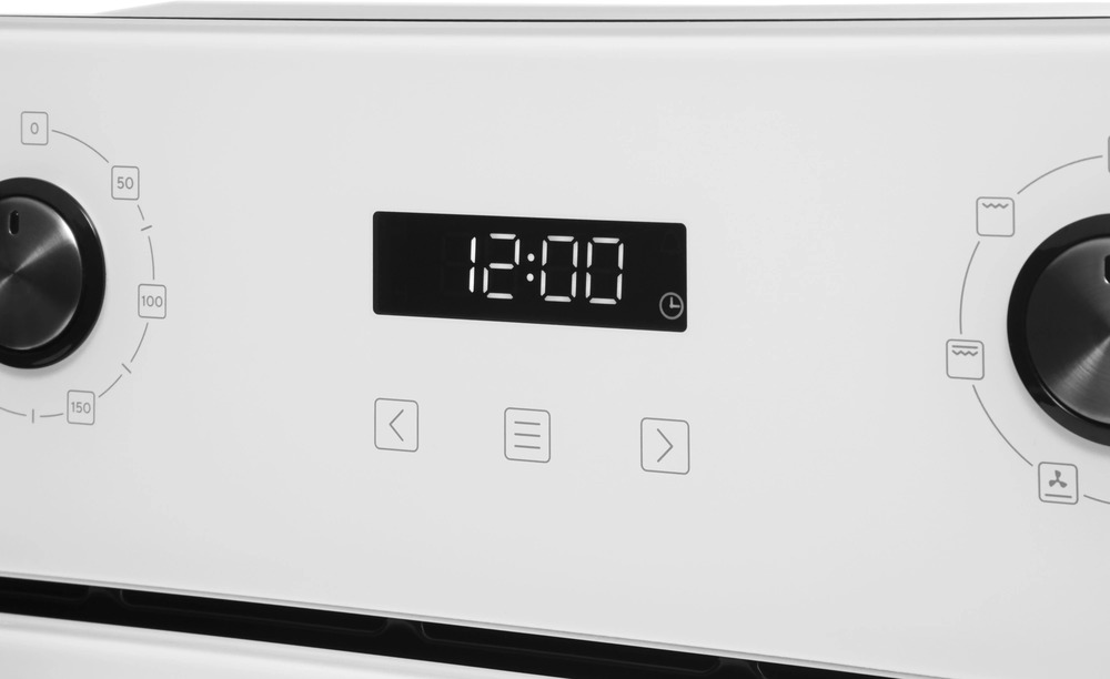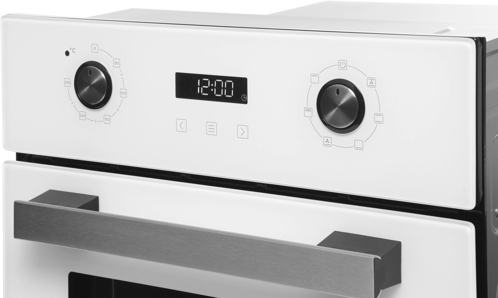 Особенности дизайна и внешней панели управления — также важный пункт при выборе духовки на кухню. В данной модели нужно обратить внимание на цвет — белое стекло, Механическая панель управления позволяет быстро разобраться в настройке программ и не требует чрезмерных усилий.