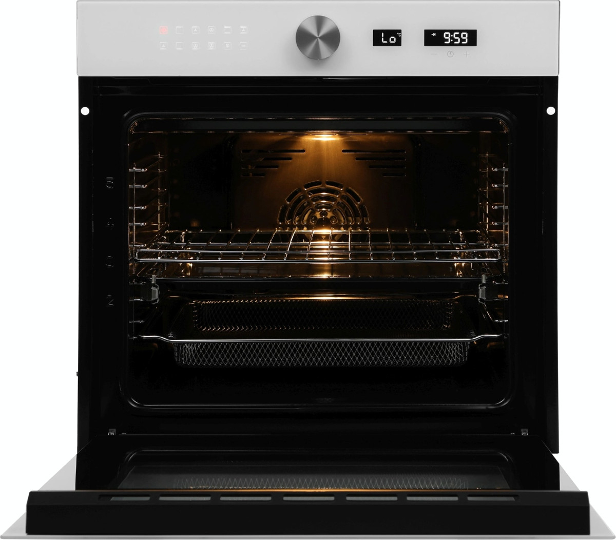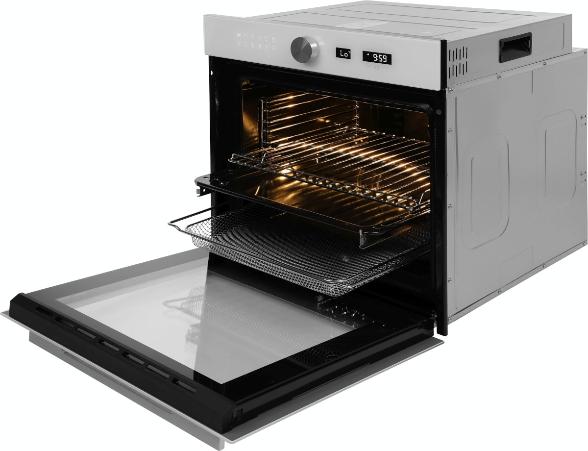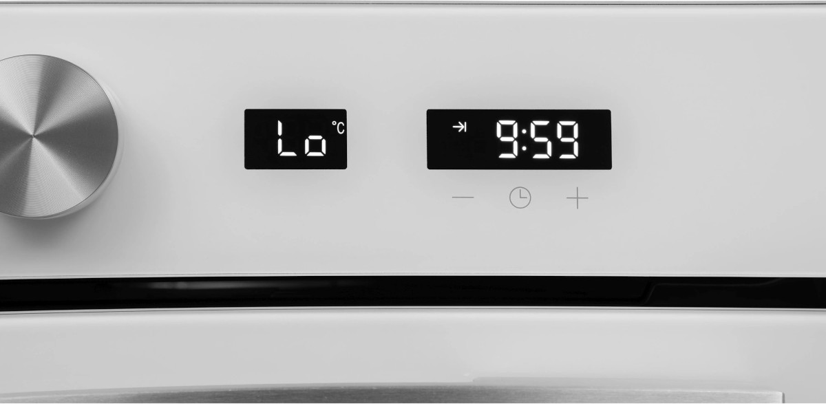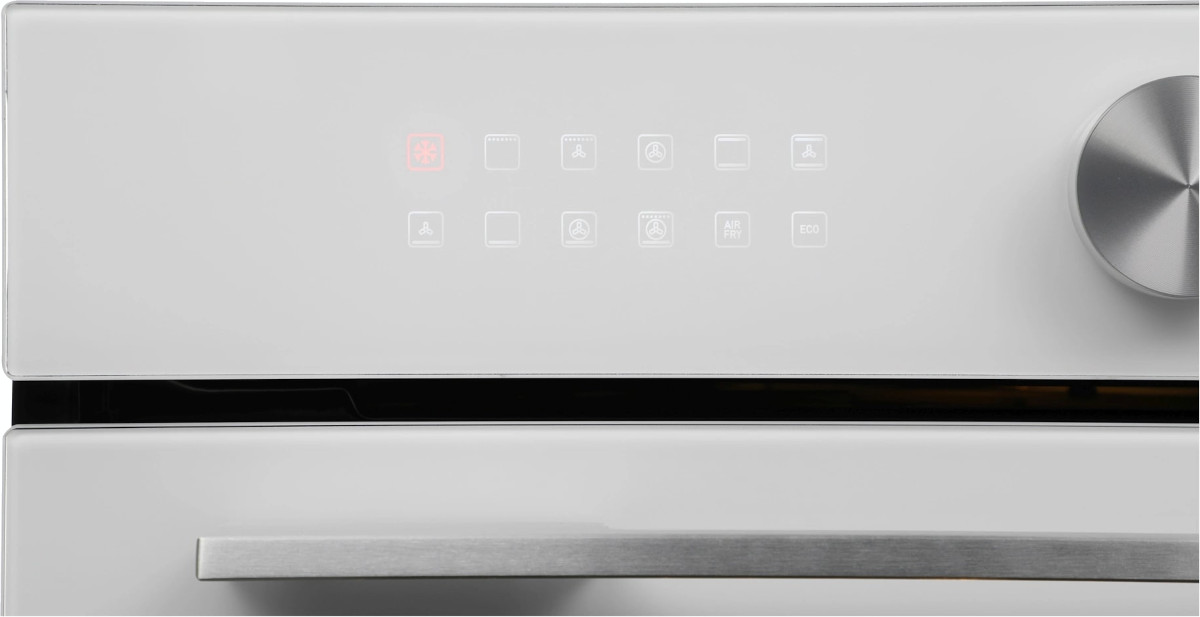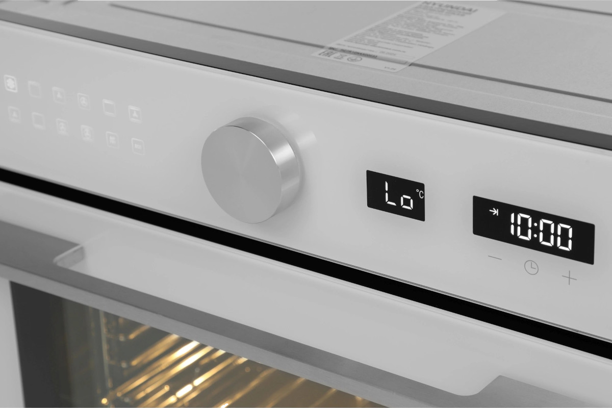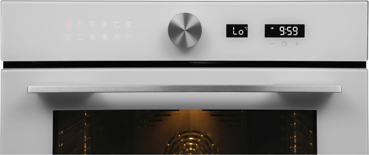 Особенности дизайна и внешней панели управления — также важный пункт при выборе духовки на кухню. В данной модели нужно обратить внимание на цвет — белый, охлаждение двери, чтобы поверхность и мебель вокруг не нагревались.