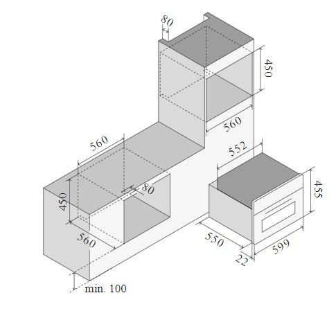 При установке духового шкафа в тумбу необходим также зазор между прибором и полом не менее 8–10 см. Если же она устанавливается в колонну, следует убедиться, что при открывании дверцы в лицо не будет ударять горячий воздух, а панель управления легко доступна. Кроме того, необходимо обеспечить свободный доступ ко всем розеткам и кабелям — они не должны размещаться непосредственно за задней стенкой духового шкафа.