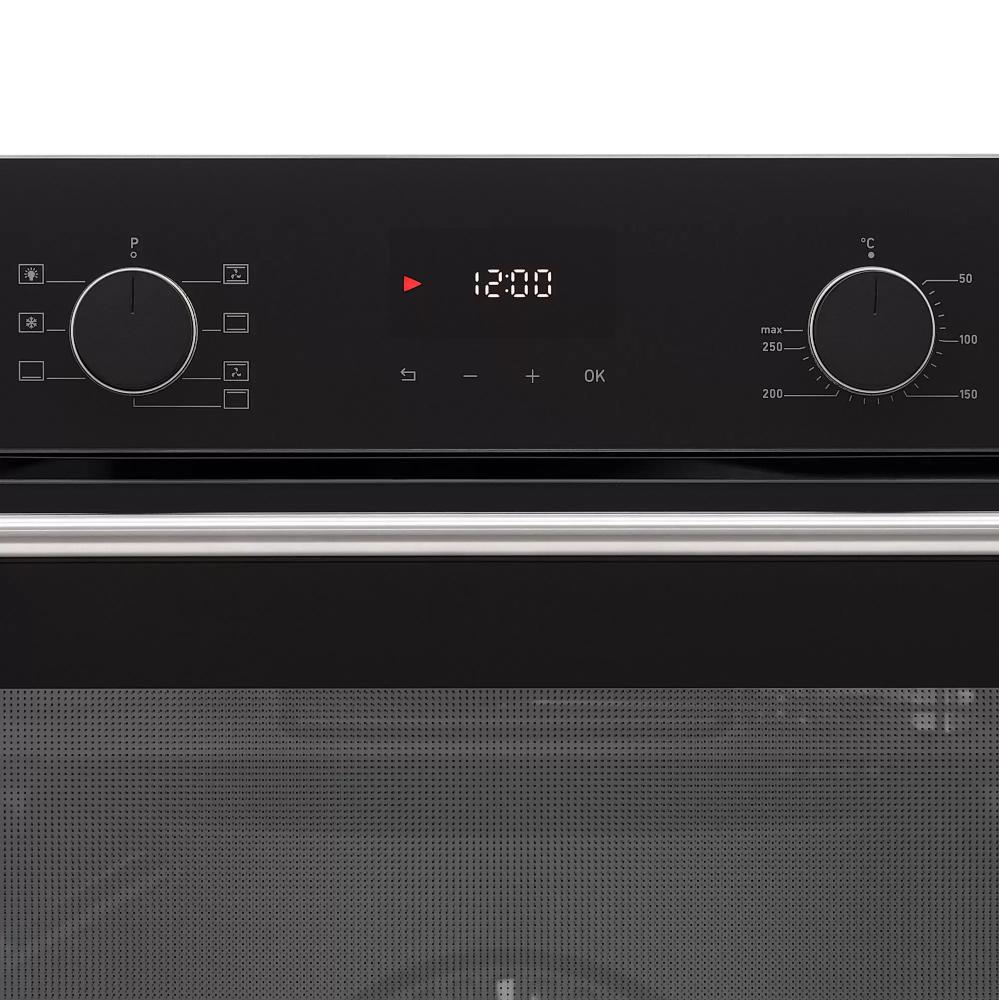Особенности дизайна и внешней панели управления — также важный пункт при выборе духовки на кухню. В данной модели нужно обратить внимание на цвет — черный,