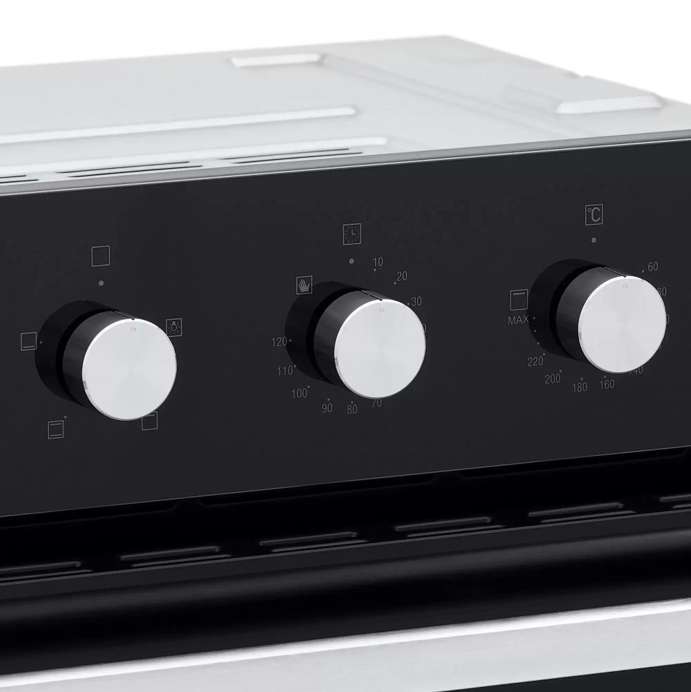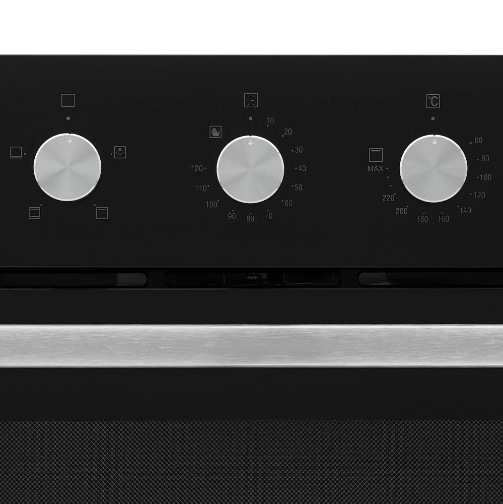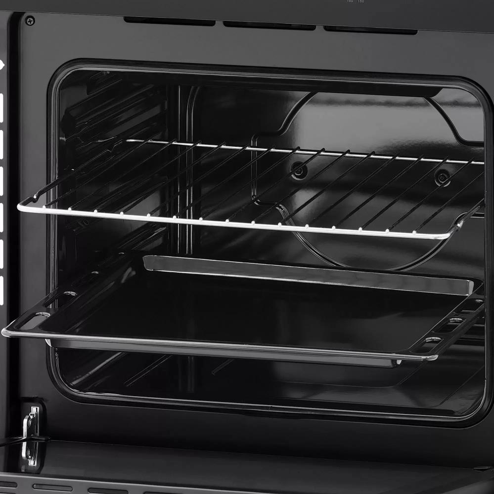 Управление представлено механическими поворотными регуляторами — это надежное и понятное решение без лишних сложностей. Таймер и регулировка температуры в диапазоне 50-260 °C помогают точно выдерживать режимы приготовления. Освещение камеры облегчает контроль готовности, а эмалевое покрытие упрощает уход: загрязнения удаляются традиционными средствами, а ровная поверхность не требует специальных технологий очистки.