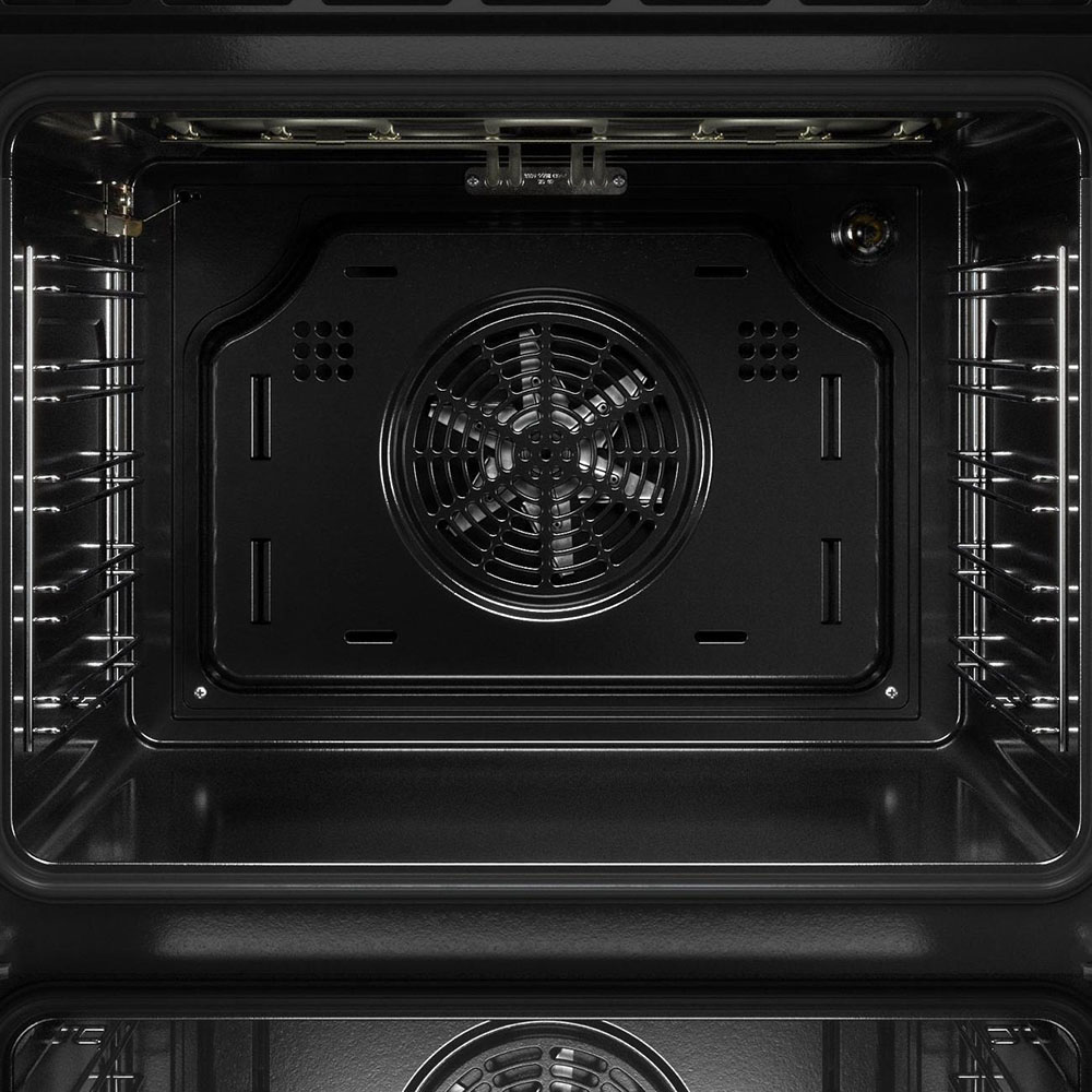 Нижний нагревательный элемент способствует быстрому повышению температуры воздуха в камере. В то же время начинает работать кольцевой нагревательный элемент на задней стенке камеры: расположенный внутри его контура вентилятор равномерно распространяет оба потока горячего воздуха по всему объему камеры. Таким образом, при размещении противня на третьем или втором уровне нижняя сторона блюда будет поджариваться за счет действия ТЭНа, а верхняя — запекаться под действием горячего воздуха, так что начинка всегда будет оставаться мягкой и сочной.