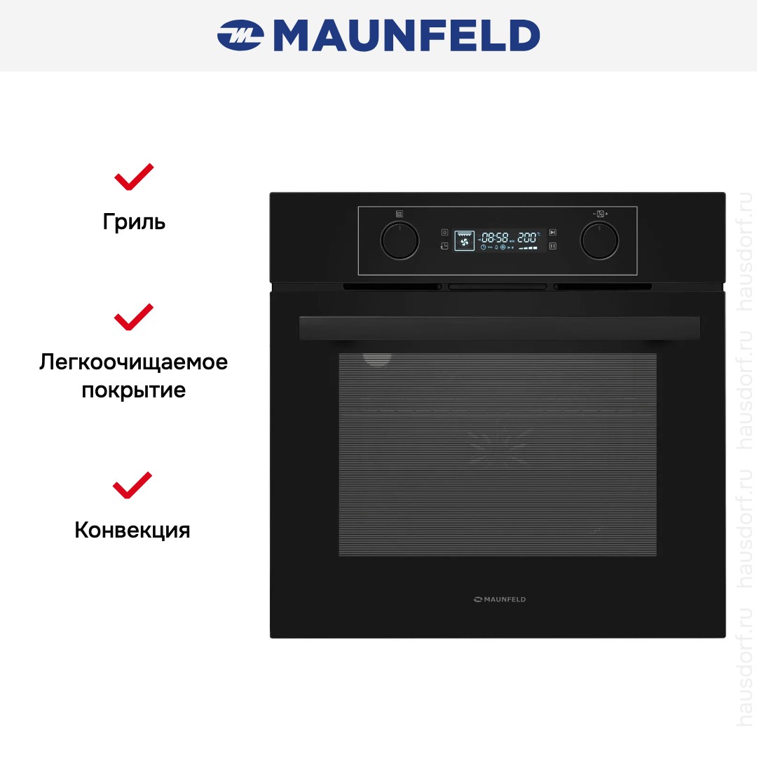 Духовой шкаф Maunfeld AEOH6062B2 — вместительный электрический прибор в лаконичном чёрном оформлении, созданный для тех, кто ценит строгий внешний вид, практичность и удобство в обращении.