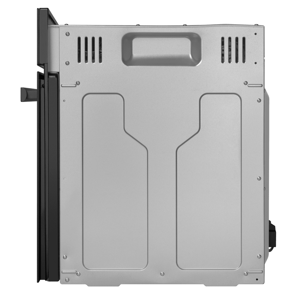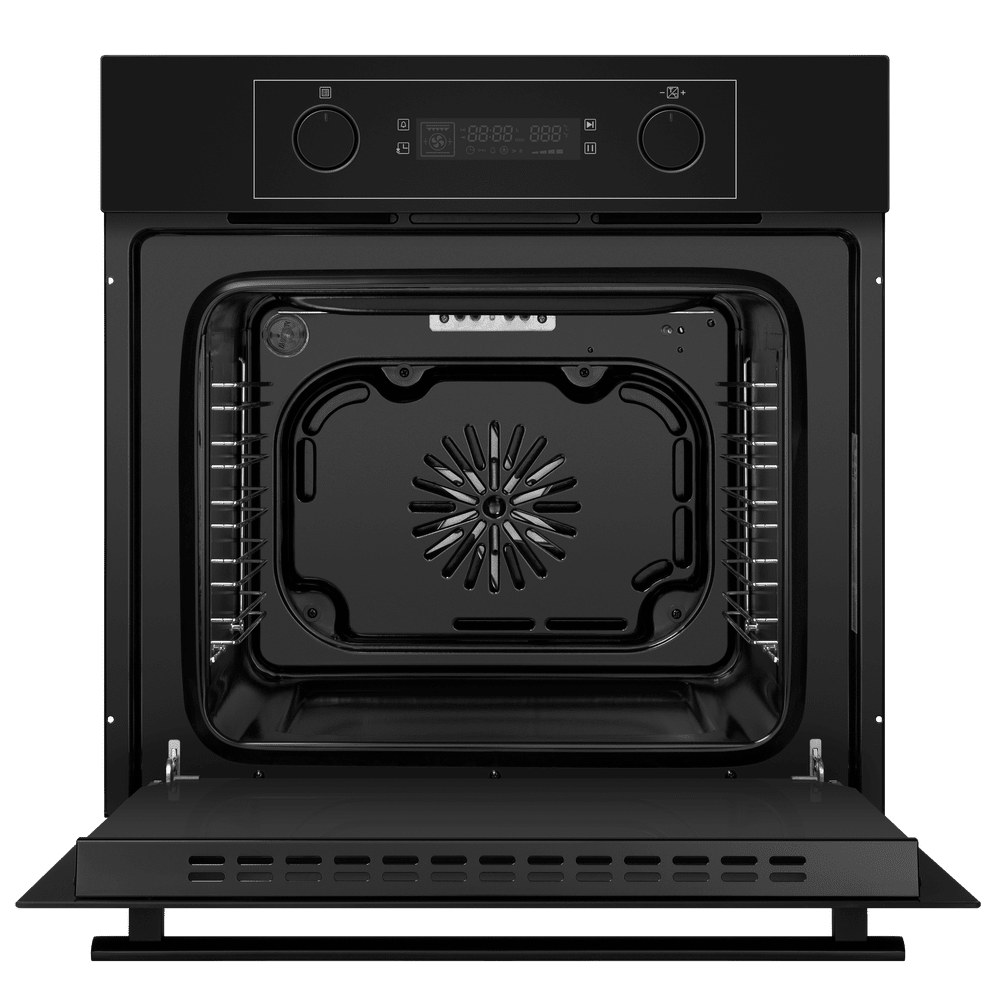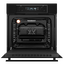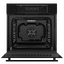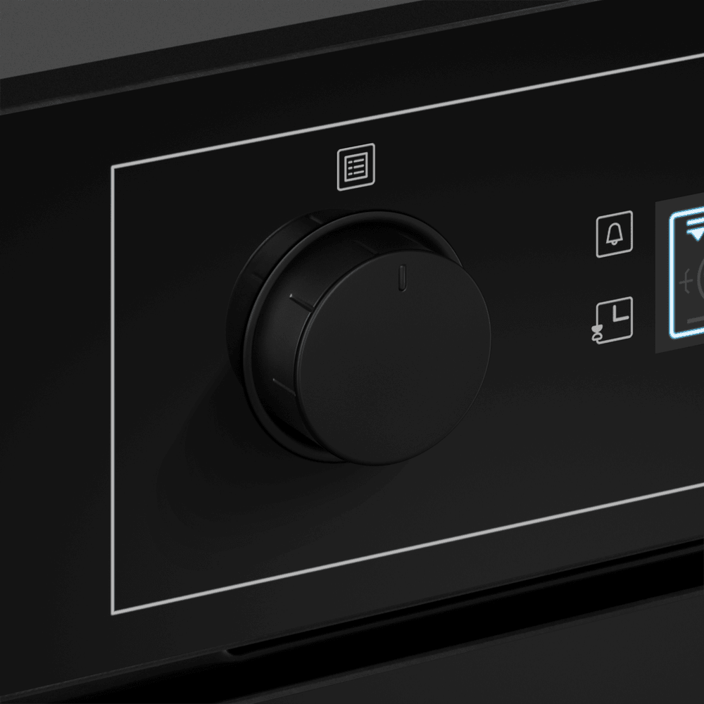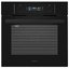 Внешне модель выделяется сплошным тёмным фасадом, матовой фурнитурой и гладкой дверцей с тремя слоями стекла. Управляющая зона оформлена в минималистичном ключе: утопленные поворотные регуляторы соседствуют с сенсорными клавишами и большим дисплеем, все вместе выглядит аккуратно и современно. Откидной механизм двери обеспечивает удобный доступ к внутренней камере, а тёмный цвет придаёт изделию выразительный, сдержанный характер.