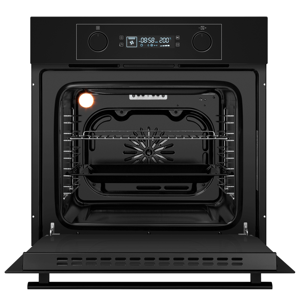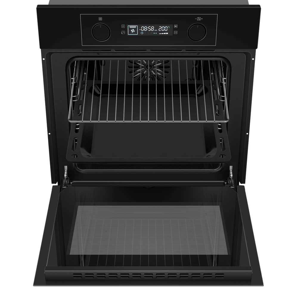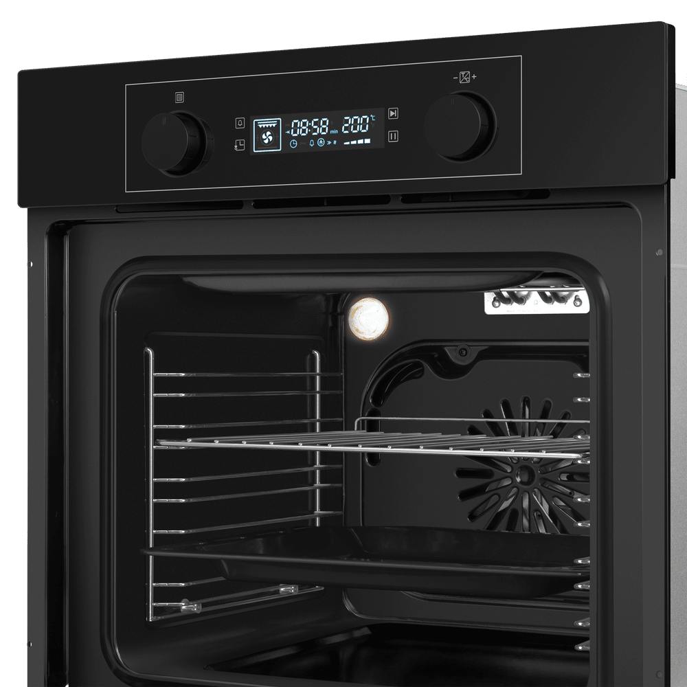 Внутри имеется объёмная камера на 60 литров, рассчитанная на большие блюда и несколько уровней запекания. Набор режимов охватывает шесть вариантов: классический верхний и нижний нагрев, принудительная конвекция с вентилятором, интенсивное жарение, традиционный гриль и комбинированный гриль с вентиляцией. Предусмотрен режим ECO для тех, кто хочет сэкономить и не торопится. В комплект входят решётка и противень, а подсветка позволяет наблюдать за ходом готовки без открытия дверцы.