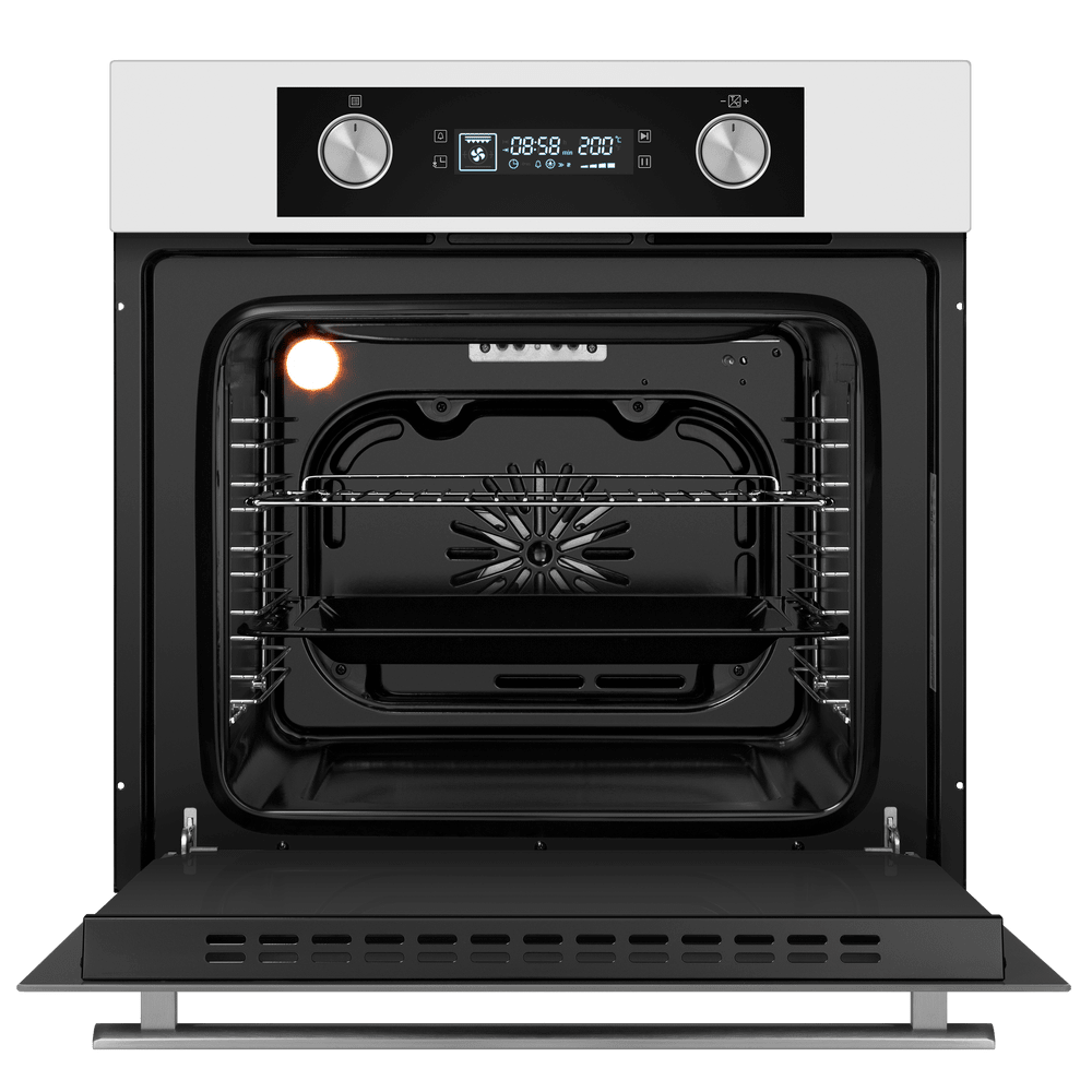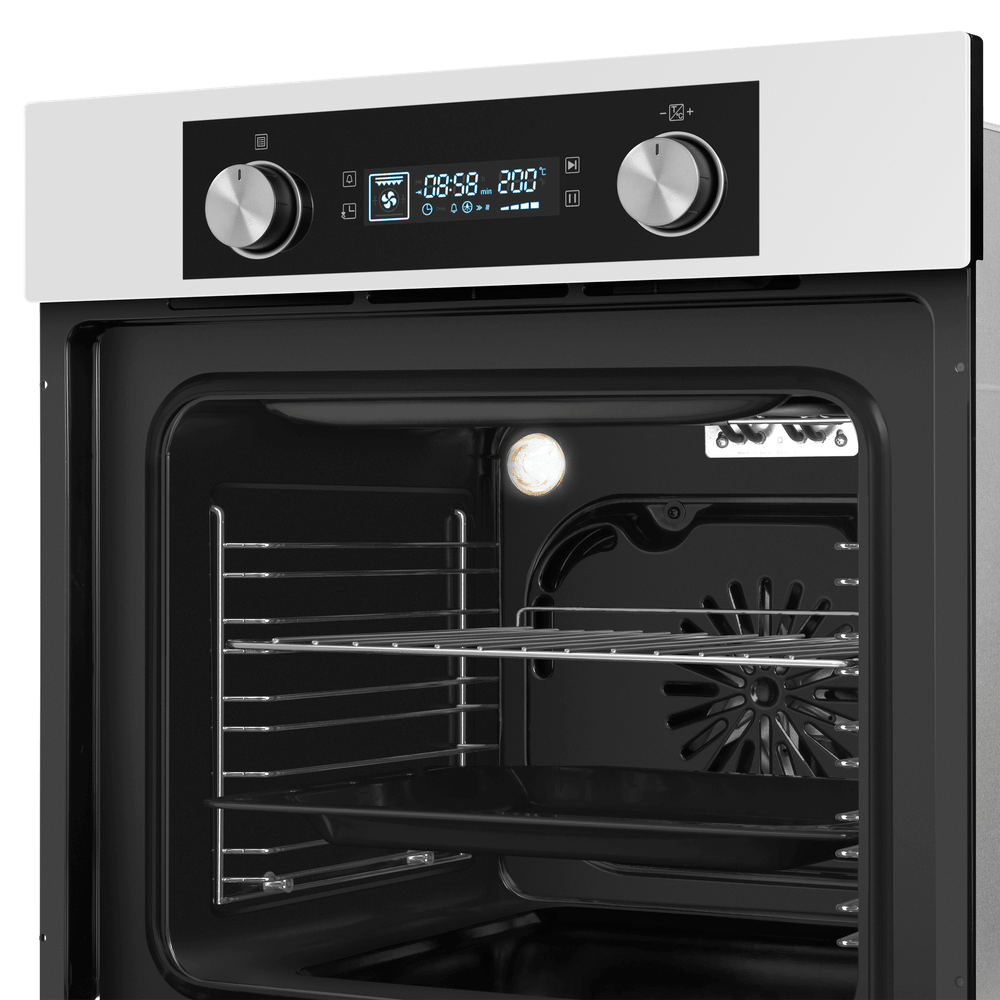 Внешне прибор выделяется лаконичным белым корпусом с эстетичными элементами из нержавеющей стали. Откидная дверца с тремя защитными стеклами придает блеска и аккуратности внешнему виду, а утопленные поворотные регуляторы вместе с сенсорными кнопками образуют информативную панель управления с дисплеем. Такое сочетание материалов и технологий легко впишется в интерьеры, близкие к минимализму, скандинавскому или современному классицизму, где требуется нейтральный, но выразительный акцент.
