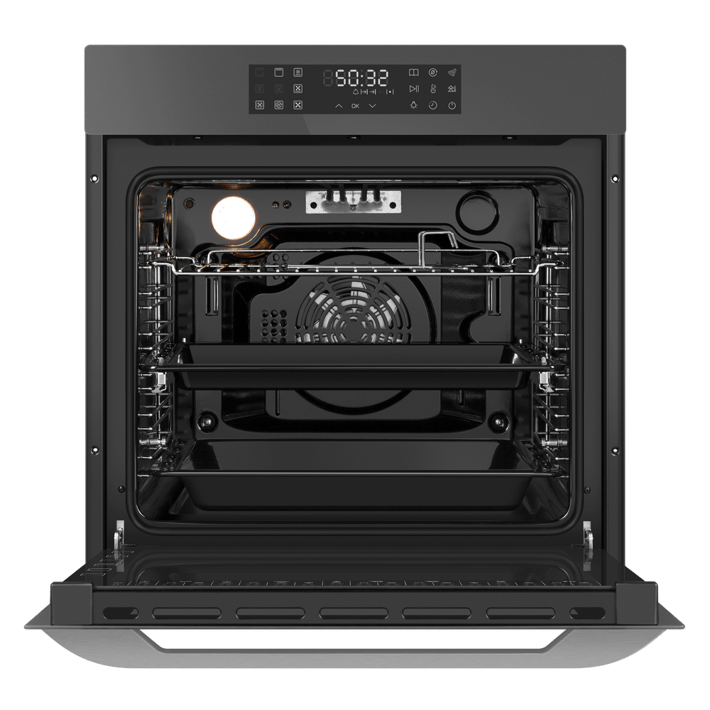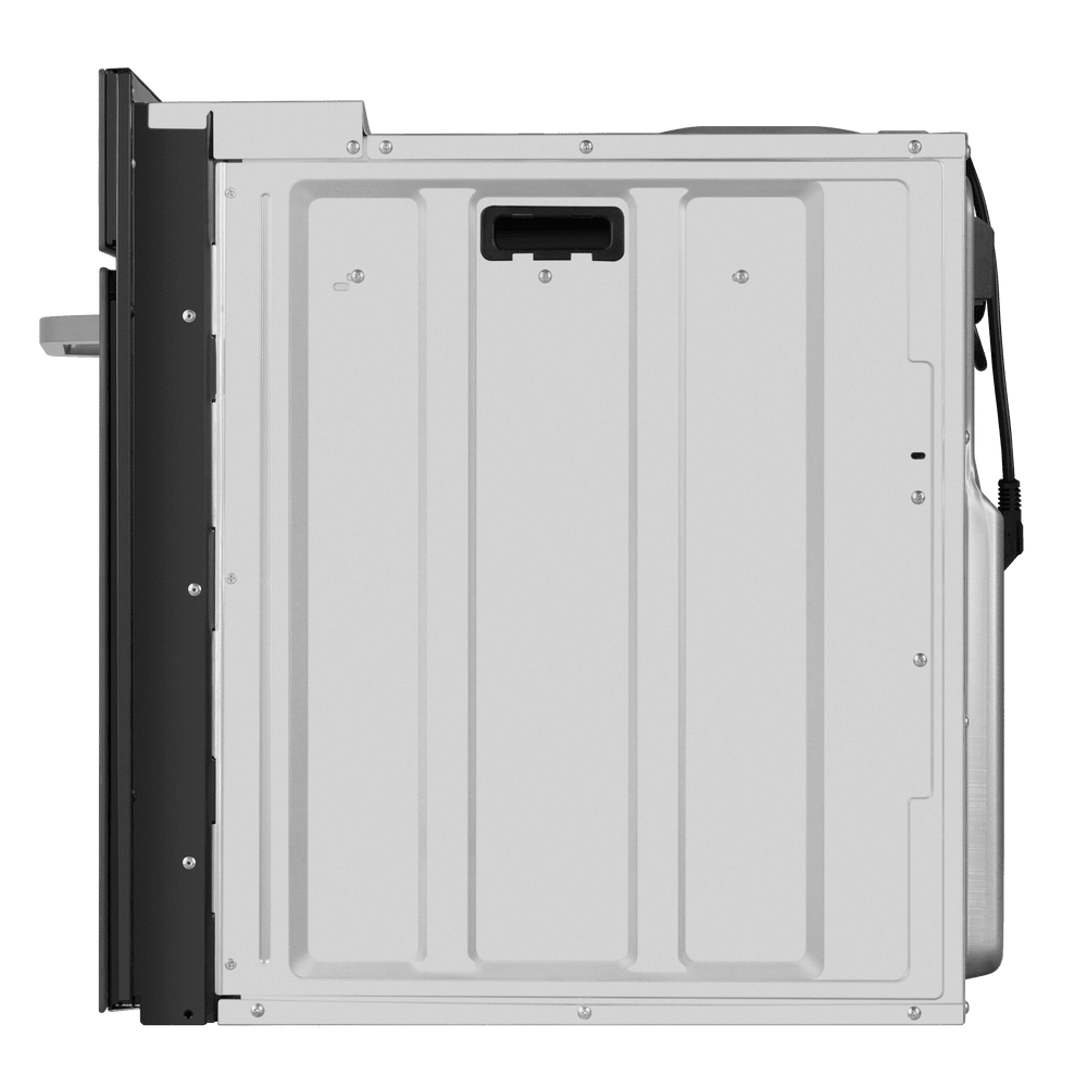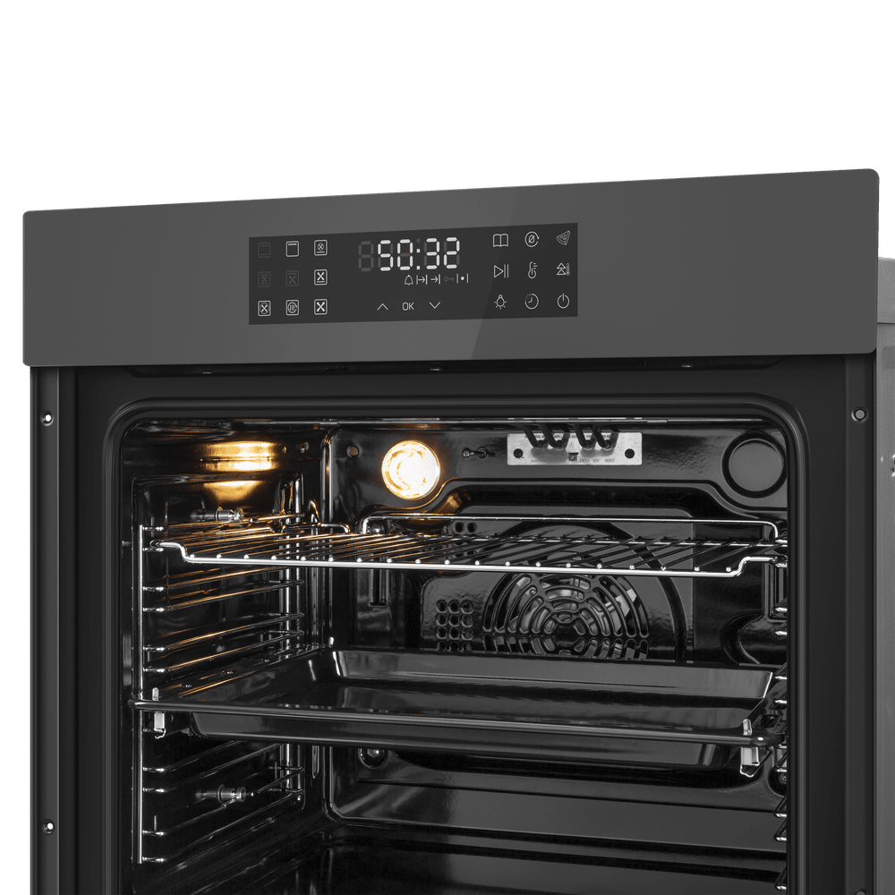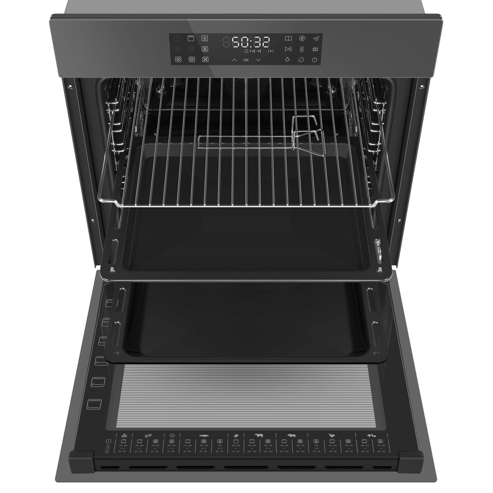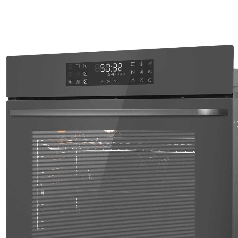 Габариты устройства составляют 59.5×59.5×57.5 см, а для встроенного монтажа предусмотрена ниша размером 60×56.4×59 см, что упрощает планировку и позволяет точно подобрать место в существующей обстановке. Объём рабочей камеры — 76 литров, внутри предусмотрено пять уровней для установки противней и решёток, так что крупные блюда и многоуровневое приготовление не станут проблемой.
