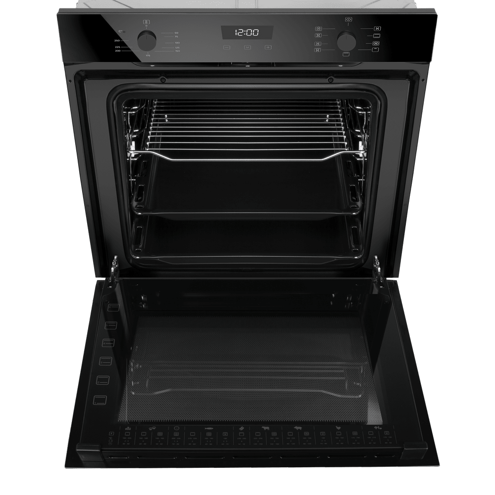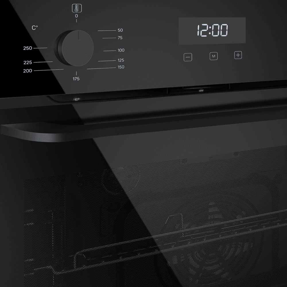 Независимый электрический духовой шкаф в элегантном чёрном корпусе с откидной дверцей и тёмной фурнитурой. Внешний вид строг и лаконичен, подходит для любых современных интерьеров. Ширина, высота и глубина около 60 см соответствуют стандартам: модели легко встраивается в типовую мебель. Сенсорная панель управления дополнена утапливаемыми поворотными регуляторами и цифровым дисплеем с часами и таймером, интерфейс удобен и понятен. Большая ёмкость камеры 76 л позволяет готовить на нескольких уровнях. Три стекла дверцы и холодный фронт не позволяют обжечься при нечаянном касании. Управление сочетает сенсорные кнопки TouchControl и механические регуляторы для задания параметров приготовления, а функция автоматического отключения завершает цикл по окончании установленного времени без участия человека.