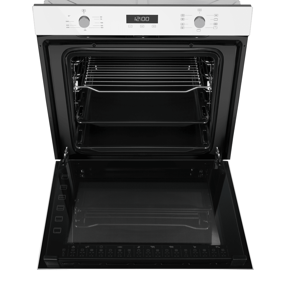 Стильный встраиваемый электрический прибор в белом цвете с серой фурнитурой и откидной дверцей оснащён тройным остеклением и холодной дверью для повышенной безопасности. Корпус и панель аккуратно вписываются в классический или современный кухонный гарнитур. Дисплей с сенсорным управлением TouchControl дополняют утапливаемые поворотные регуляторы, что облегчает настройку параметров, выбор режимов и длительности готовки.