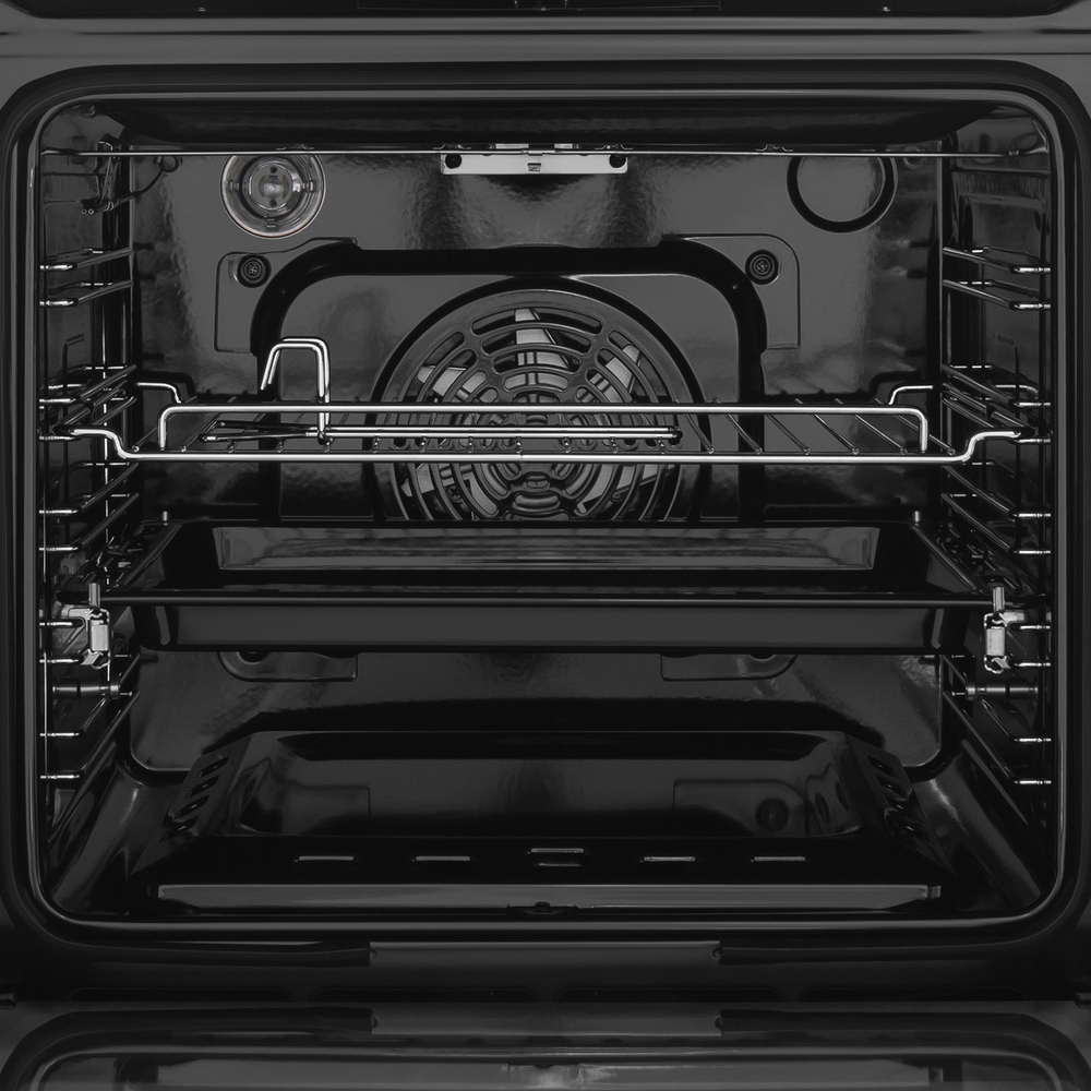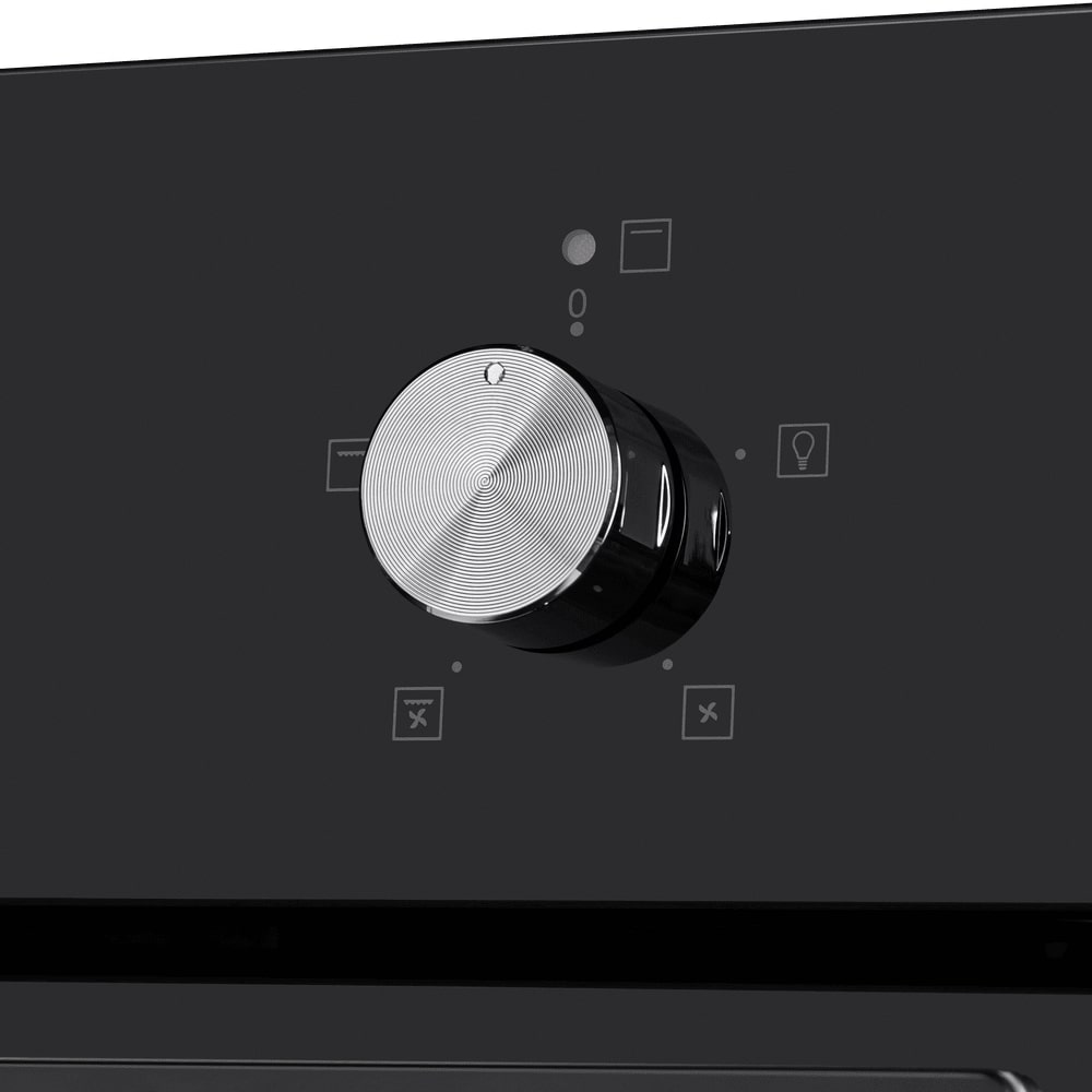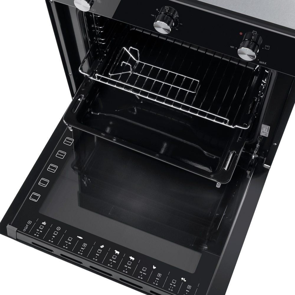 Управление механическое, посредством поворотных переключателей, отличается простотой и надёжностью. Поворотом рукоятки устанавливаются температура, длительность готовки, режим работы. Всего доступны четыре режима: конвекция с вентилятором, гриль, гриль с конвекцией, а также нижний газовый нагрев с вентилятором и традиционное нижнее нагревание. Мощность гриля достигает 2 кВт, а максимальная температура в камере составляет 250 °C. Для удобства в комплект входят решётка, противень, глубокий поддон и одноуровневые телескопические направляющие. Безопасность поддерживается газ-контролем с прекращением подачи газа, если пламя угаснет. Электроподжиг позволяет зажечь горелки поворотом ручки, без спичек, для него необходимо подключение к сети электропитания 220-240 В. Класс энергопотребления A, вес нетто 30 кг.