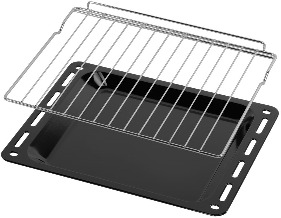 В стандартную комплектацию любого духового шкафа входят один или два противня — эмалированных или с антипригарным покрытием — и решетка. Единственный противень, как правило, имеет низкие бортики и предназначается для приготовления выпечки. Если духовка комплектуется двумя противнями, то второй отличается более высокими бортиками — его можно использовать для запекания мяса, птицы, овощных блюд. На решетке в духовке, не оснащенной грилем, обычно устанавливаются формы для запекания — стальные, керамические или стеклянные. В духовках премиум-класса количество противней может быть увеличено: к стандартному комплекту добавляются противни с перфорацией для мяса, специальные поддоны для сбора выделившегося сока.