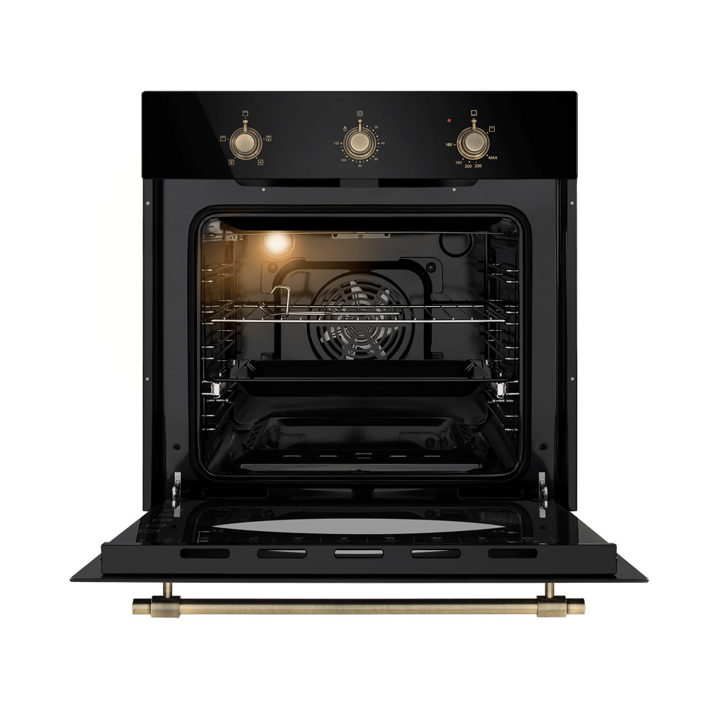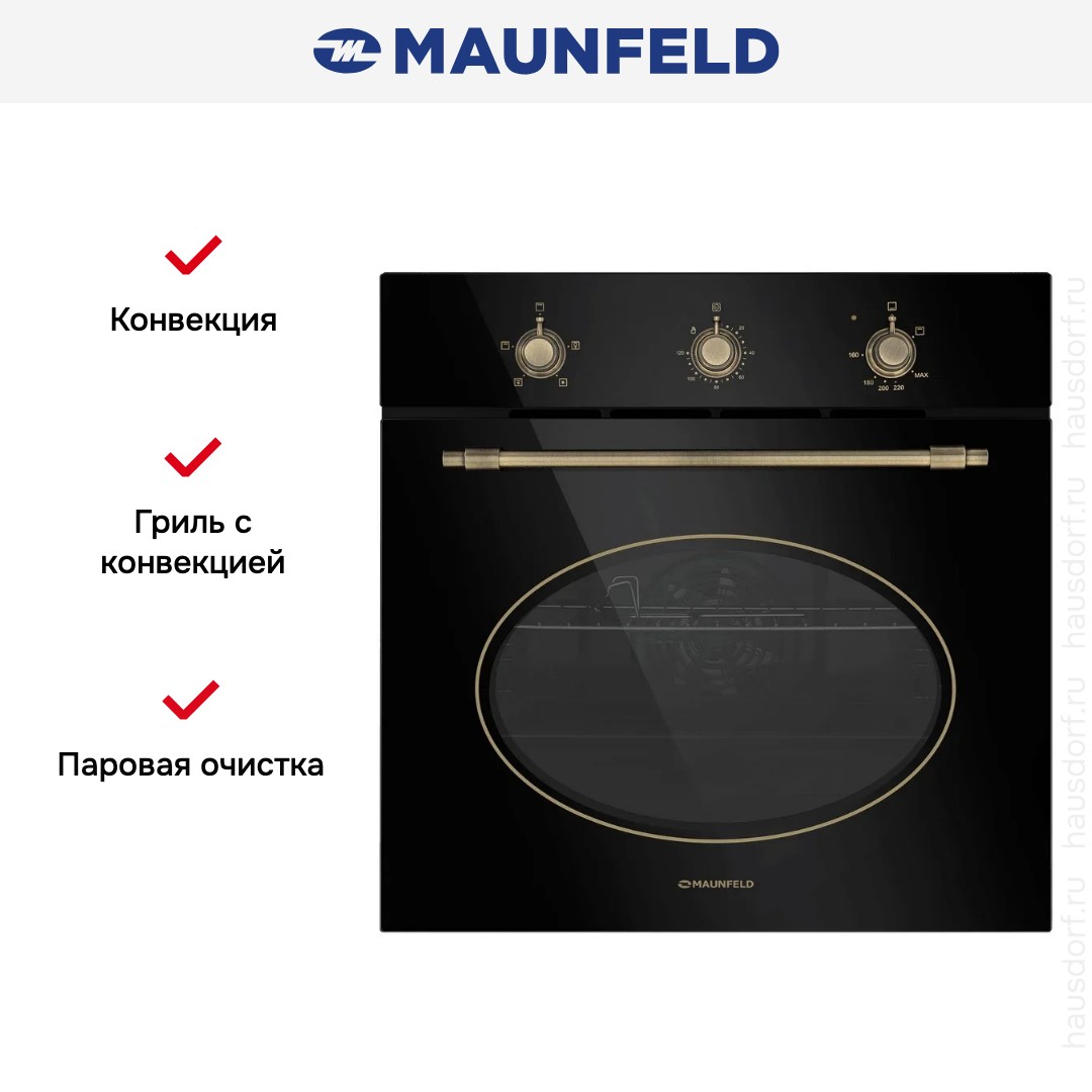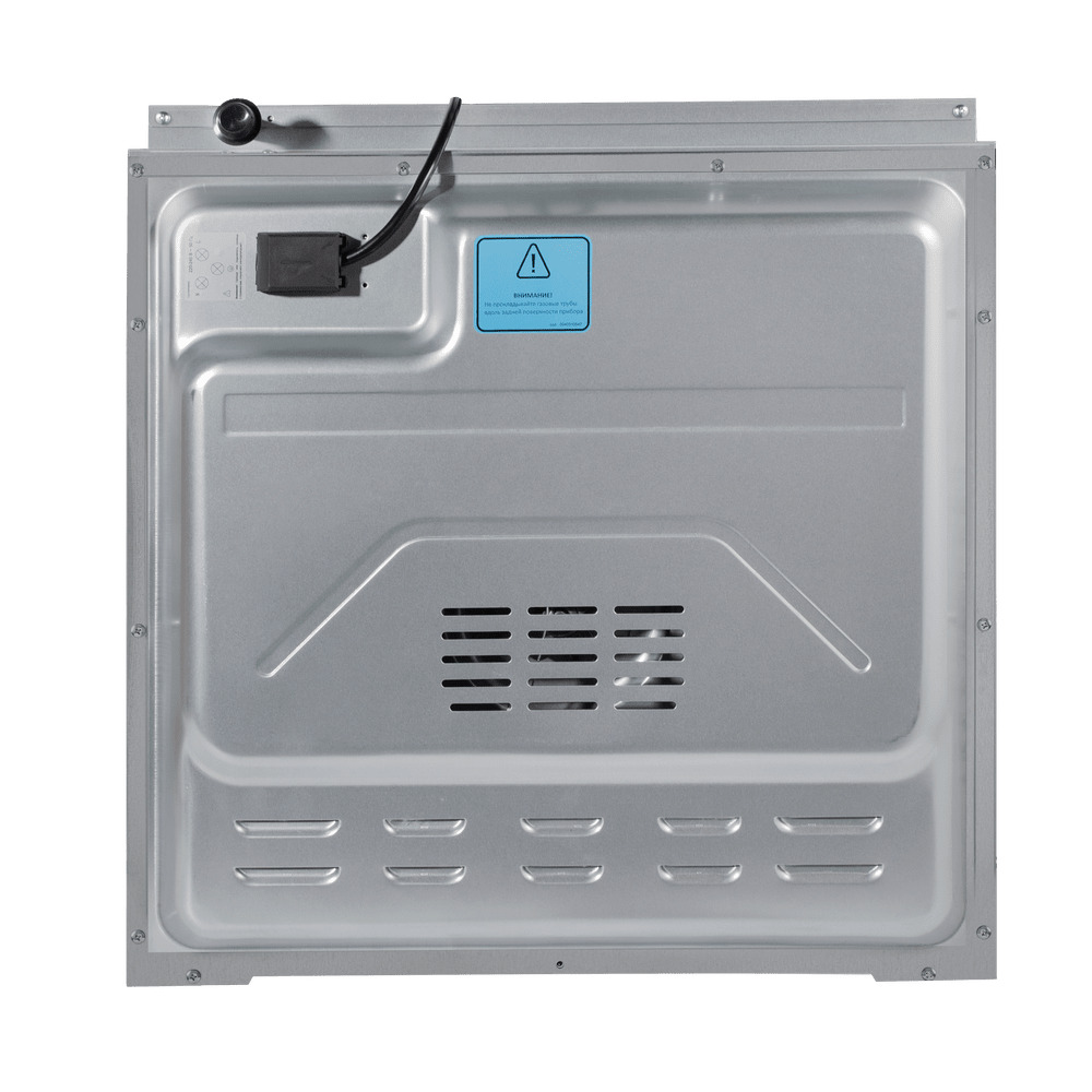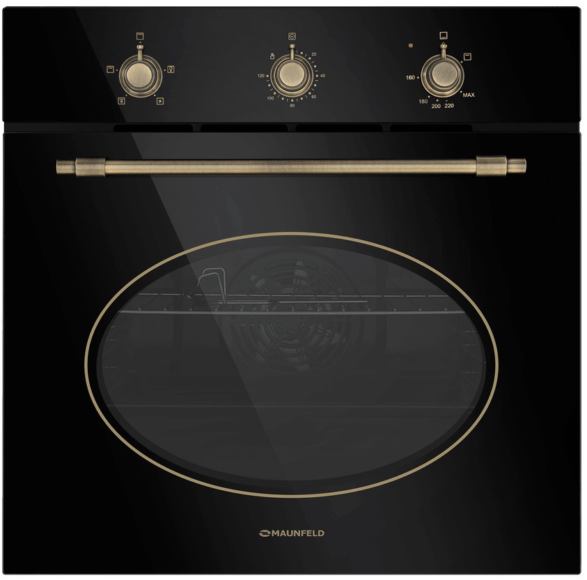 Устройство выполнено в строгом черном цвете с бронзовой фурнитурой и откидной дверцей с тремя стеклами, обеспечивающей эффект «холодной двери». Корпус предназначен для независимого монтажа и впишется в современный кухонный гарнитур благодаря компактным габаритам 59,8×59,5×57,3 см и нише для встраивания 58,5—59×55,6—59×56 см. Внутренняя камера объемом 60 л предлагает пять уровней для установки противней, а телескопические направляющие (одноуровневые), решетка и противень входят в комплектацию, дополнительно поставляются глубокий поддон и прихват для противня.