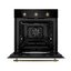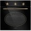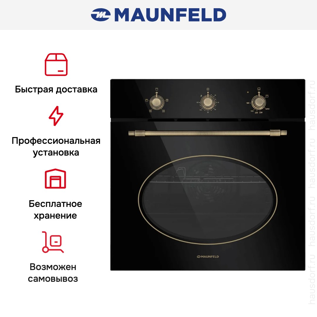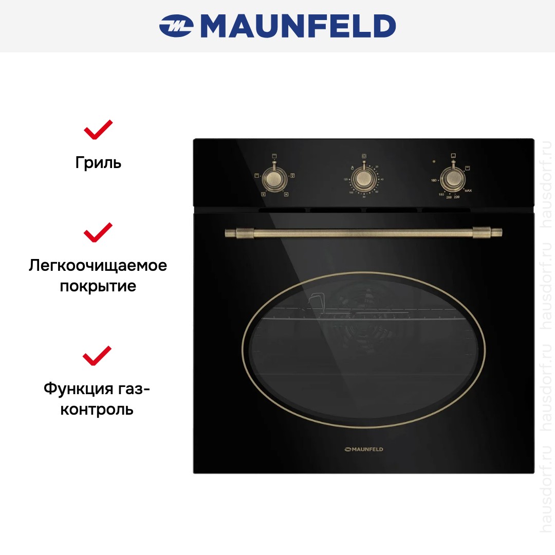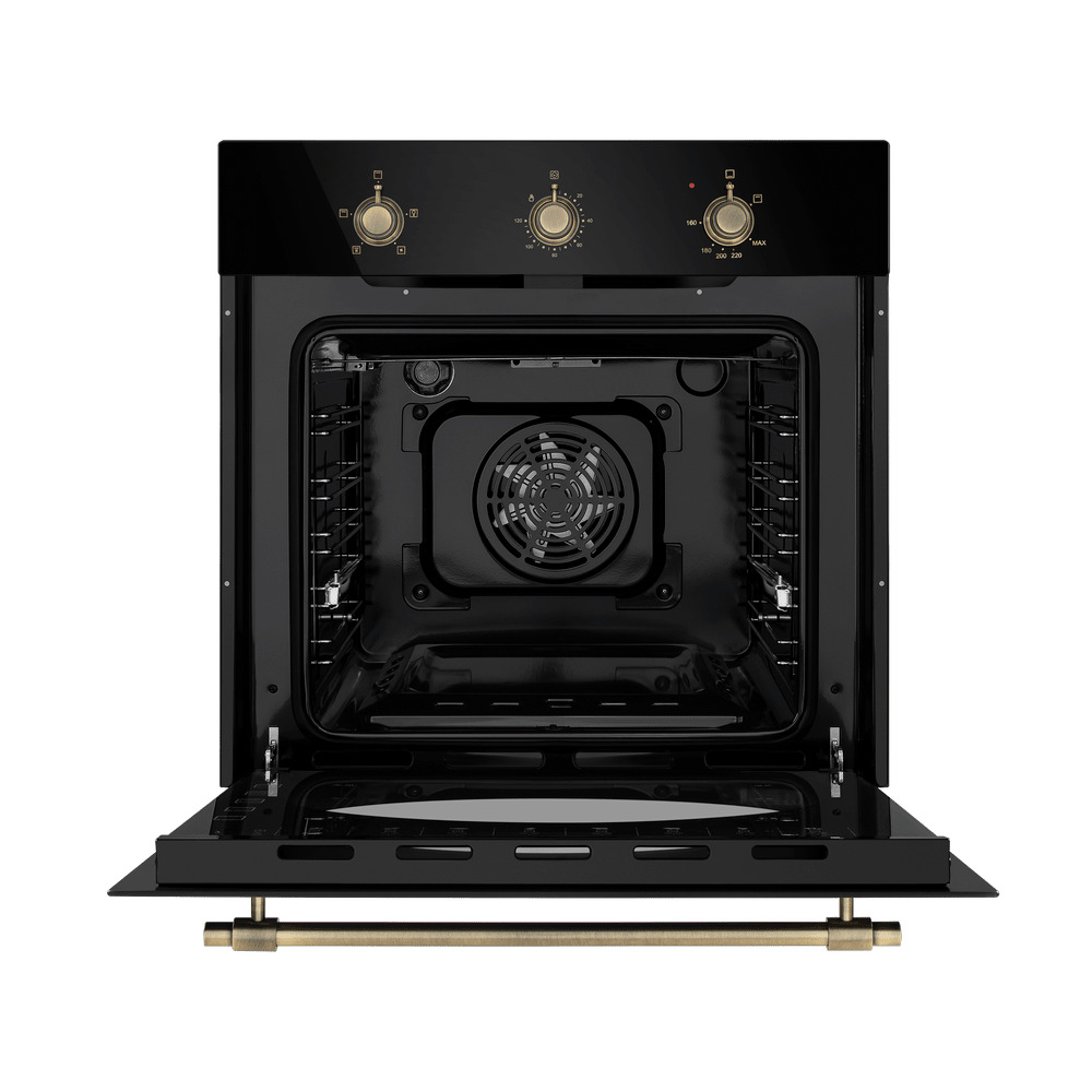 Устройство выполнено в строгом черном цвете с бронзовой фурнитурой и откидной дверцей с тремя стеклами, обеспечивающей эффект «холодной двери». Корпус предназначен для независимого монтажа и впишется в современный кухонный гарнитур благодаря компактным габаритам 59,8×59,5×57,3 см и нише для встраивания 58,5—59×55,6—59×56 см. Внутренняя камера объемом 60 л предлагает пять уровней для установки противней, а телескопические направляющие (одноуровневые), решетка и противень входят в комплектацию, дополнительно поставляются глубокий поддон и прихват для противня.