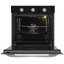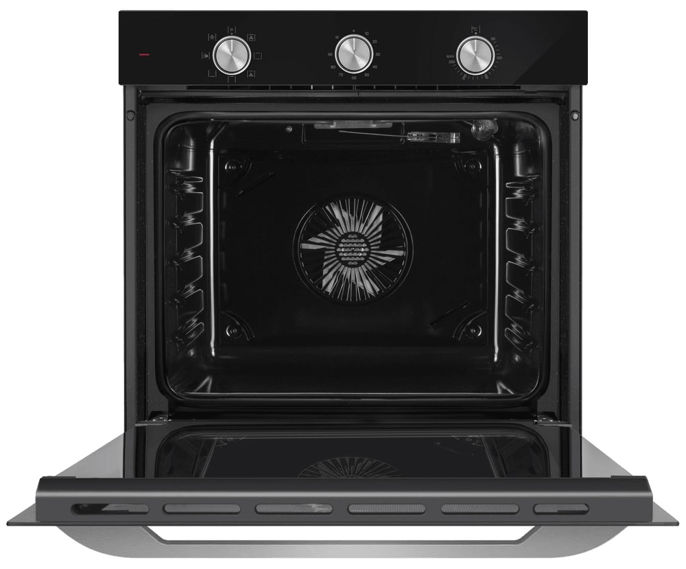 Независимая электрическая духовка хорошо смотрится в кухне благодаря темной фронтальной панели и небольшим металлическим акцентам. Ровные пропорции корпуса (59.5×59.5×57 см) позволяют встраивать прибор в подготовленную нишу 59.5×56.8×55.5 см без зазоров и сложных подгонок. Лицевая часть лаконична: утапливаемые поворотные регуляторы исчезают заподлицо, не цепляются за рукав и упрощают уборку. Откидная дверца открывается мягким движением, а трехслойное остекление удерживает жар внутри камеры. Ручка из нержавеющей стали надежна и визуально уравновешивает темный фасад.