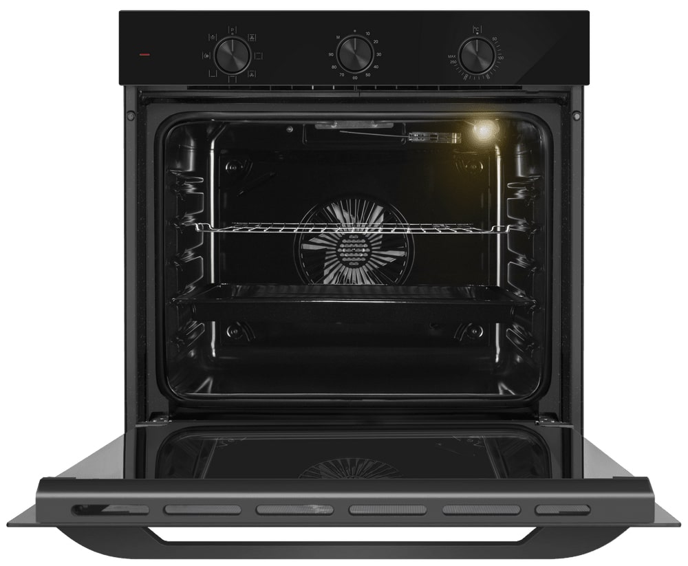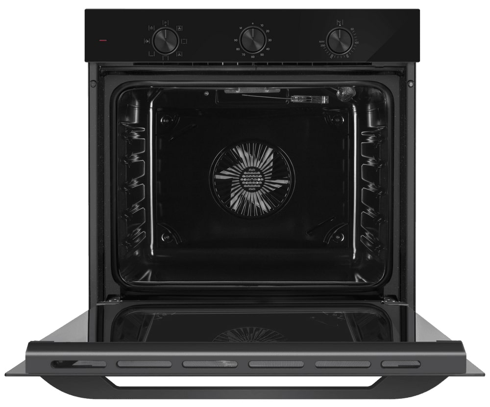 Независимый электрический духовой шкаф в лаконичном чёрном исполнением впишется в минималистичный современный кухонный интерьер. Дверца откидывается вперед, в нее вставлено трёхслойное остекление, так что поверхность остается холодной. Вместе с чёрной фурнитурой она создаёт впечатление строгости и аккуратности. Еще одна особенность — камера очень большого объёма 78 л, противни в ней могут размещаться на пяти уровнях направляющих. Габариты прибора 59.5×59.5×57 см соответствуют стандартам, модель встраивается в нишу при помощи крепежного набора.