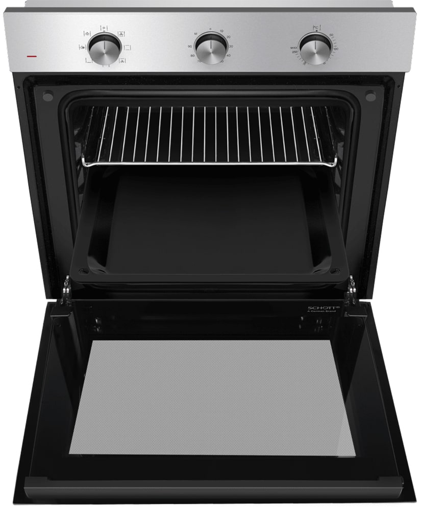 Независимая электродуховка с фасадом цвета нержавеющей стали с фурнитурой в тон и дверцей с черным остеклением соответствует современной минималистичной эстетике. Прибор станет гармоничным дополнением кухонь в стиле хай‑тек, лофт или сканди. Откидная дверца с трёхслойным стеклом обеспечивает дополнительную теплоизоляцию, дает удобный обзор блюд. Внутренняя камера объёмом 78 л с пятью уровнями приготовления предоставляет простор для любых кулинарных экспериментов или ежедневного использования. Механическое управление с утапливаемыми переключателями и таймером интуитивно понятно и надёжно в эксплуатации.