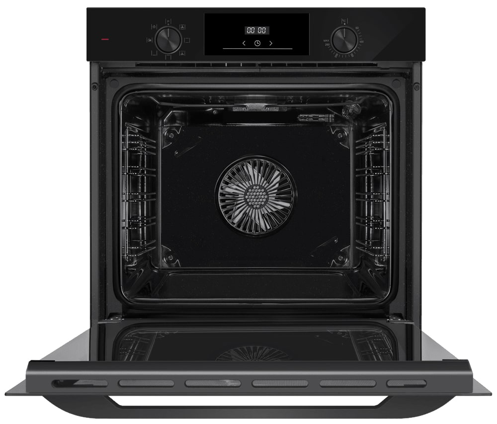 Элегантный встраиваемый прибор в чёрном исполнении сочетает строгую геометрию прямых линий и лаконичную фурнитуру. Плоская фронтальная панель с дисплеем и сенсорными кнопками дополнена утапливаемыми поворотными регуляторами. Откидная дверца со стеклом в три слоя обеспечивает хорошую теплоизоляцию и смотрится стильно и достойно. Габариты 59.5×59.5×57 см гарантируют встраивание в обычную мебель без особенностей, позволяют вписать прибор в современные и классические кухонные интерьеры.