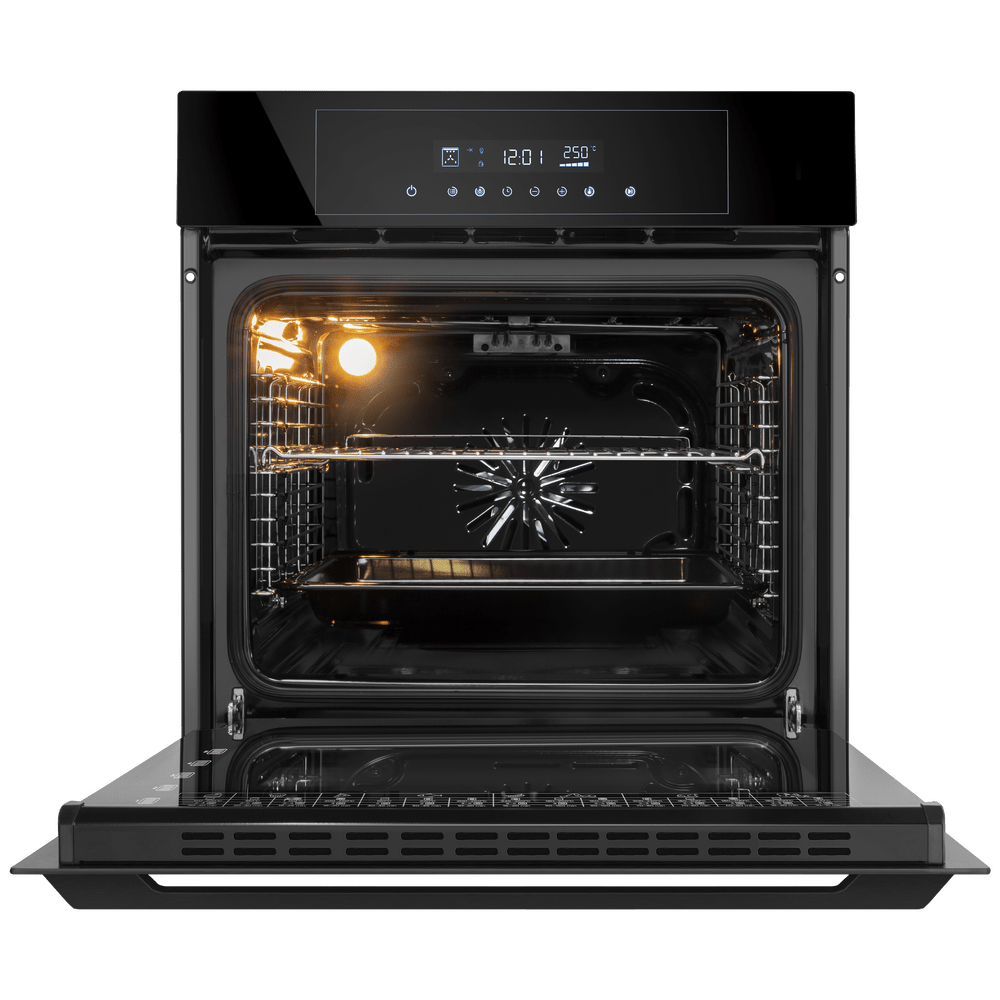 Сенсорное управление упрощает настройку: параметры выбираются точечно и без усилий, а информация считывается с дисплея. Защита от детей блокирует изменения, когда панель трогают случайно. Освещение камеры дает возможность проверять степень готовности без лишнего открытия дверцы. Уход не отнимает много сил: паровая очистка размягчает загрязнения, после чего достаточно протереть внутренние поверхности. В комплекте есть глубокий поддон — удобно для сочных запеканок, птицы и блюд, где важно собрать выделяющийся жир и сок.