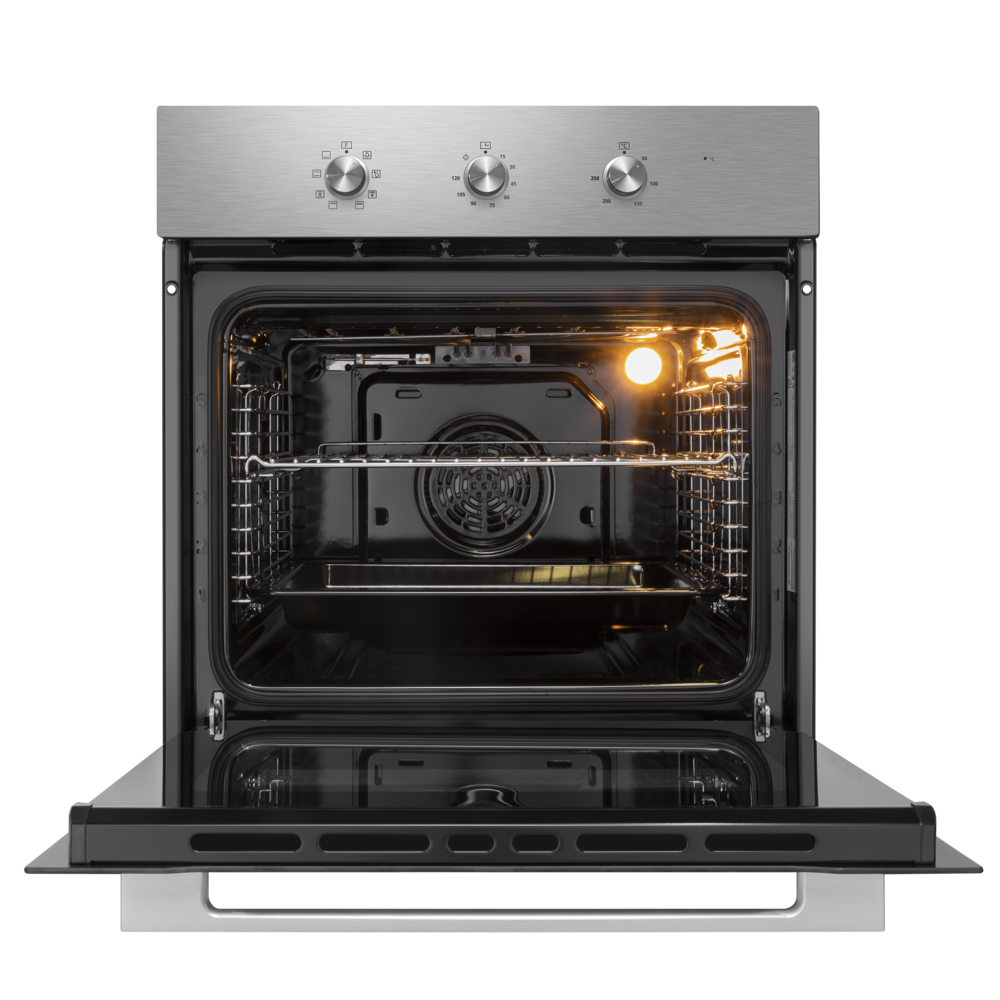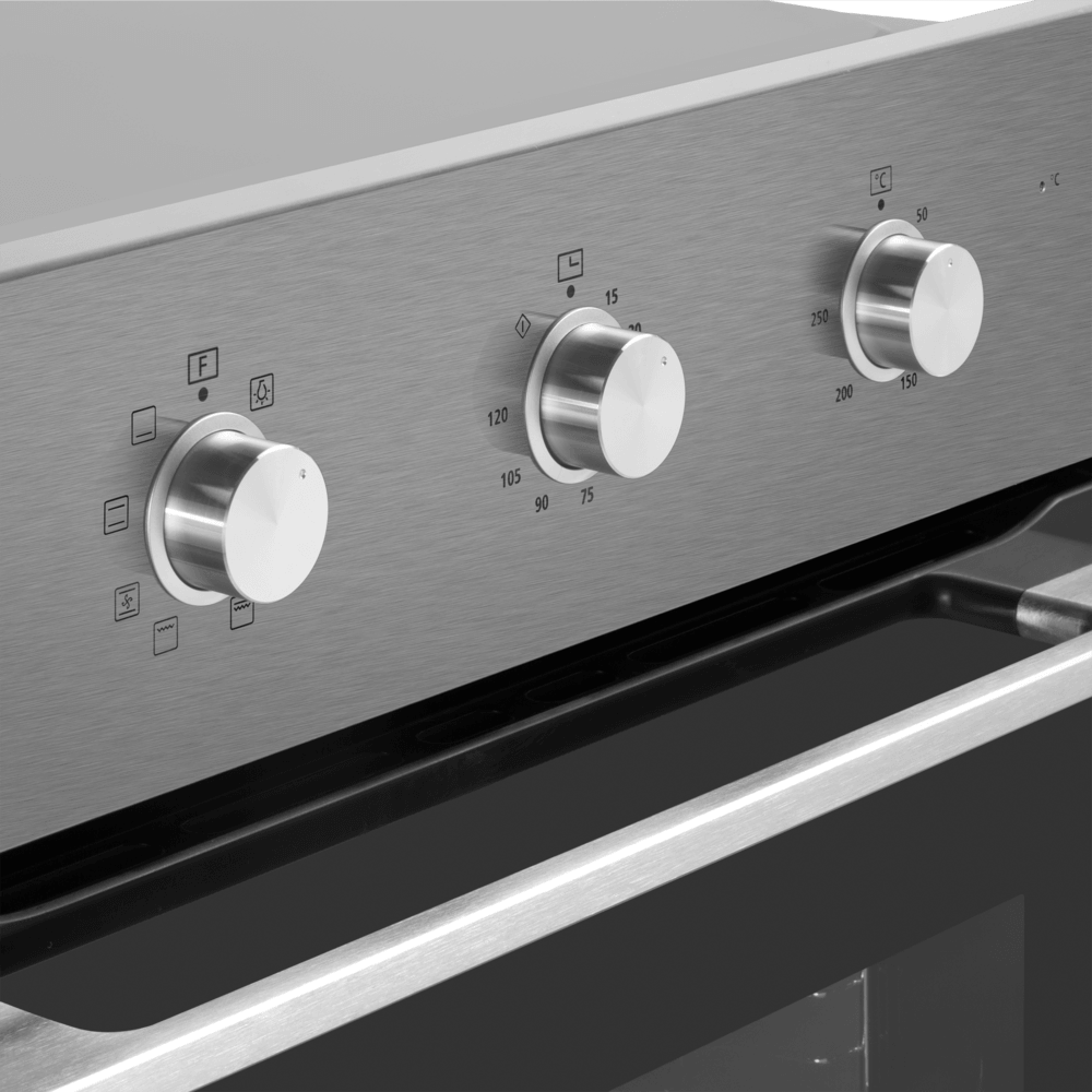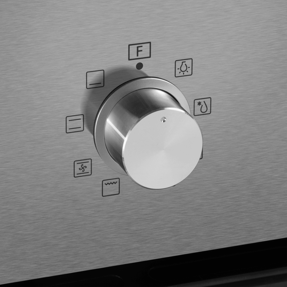 Панель управления механическая и снабжена поворотными регуляторами, что повышает долговечность и обеспечивает понятную настройку режимов. Таймер помогает не заниматься постоянным отслеживанием процесса, а внутреннее освещение удобно для визуальной проверки без открытия дверцы. Двойное стекло и система «холодная дверь» снижают теплопотери и делают эксплуатацию безопаснее при наличии детей.