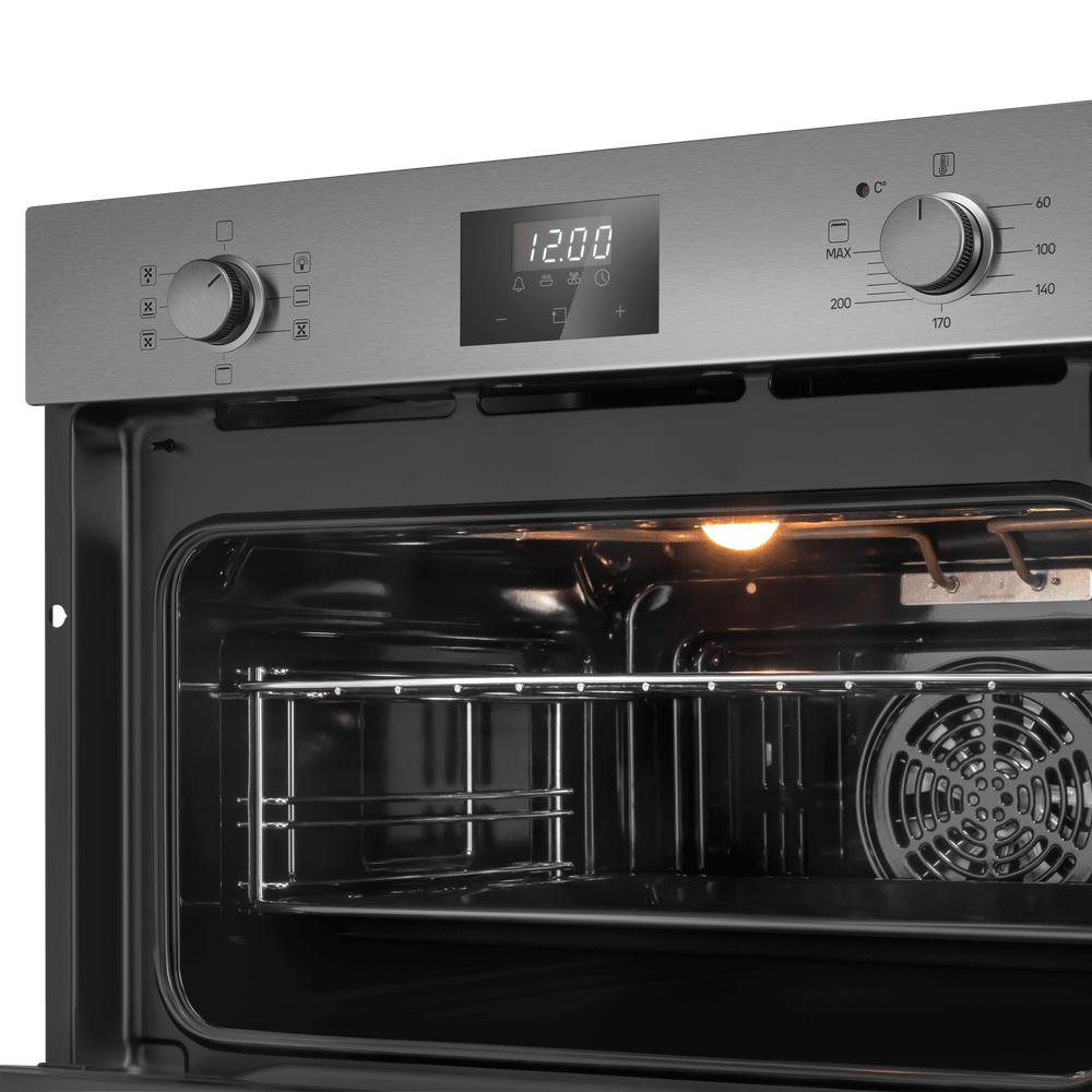Управление реализовано через сенсорные кнопки и поворотные регуляторы, дополненные информативным дисплеем, часами и таймером. Сенсор упрощает точную настройку режимов, а утапливаемые ручки сохраняют аккуратный внешний вид. Наличие автоматического отключения в конце цикла и блокировки настроек от детей и позволяет спокойнее заниматься домашними делами, пока техника работает. Освещение камеры помогает контролировать процесс без частого открытия дверцы.