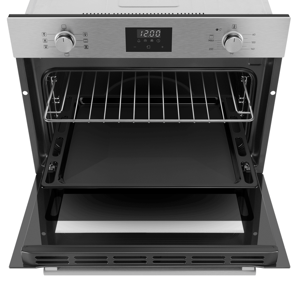 Внутренняя эмаль легкой очистки в сочетании с паровой системой обслуживания делает уход максимально простым. Дверца откидного типа оснащена доводчиком, двумя стеклами и системой «холодная дверь», что уменьшает теплопотери и риск ожогов при случайном прикосновении. Для приготовления в комплекте идут решетка и противень. Максимальная температура до 250°C подходит для разных задач: выпечки, запекания и быстрого подрумянивания.