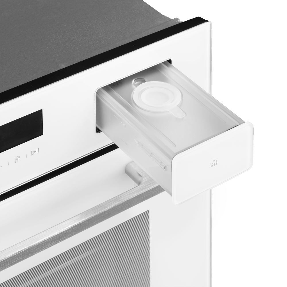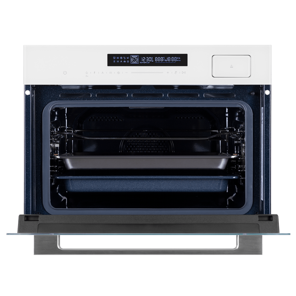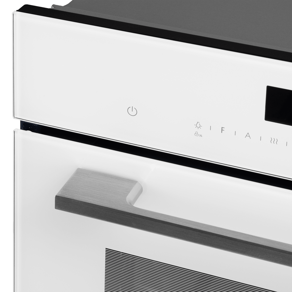 Дизайн выполнен в белом цвете с серебристой фурнитурой. Откидная дверца снабжена двумя стеклами для лучшей теплоизоляции. Сенсорное управление с дисплеем и таймером делает работу интуитивно понятной, а часы и встроенные автоматические программы упрощают планирование приготовления. Панель TouchControl быстро реагирует на касания, есть функция защиты настроек от детей для безопасности. Автоматическое отключение в конце цикла повышают удобство эксплуатации.