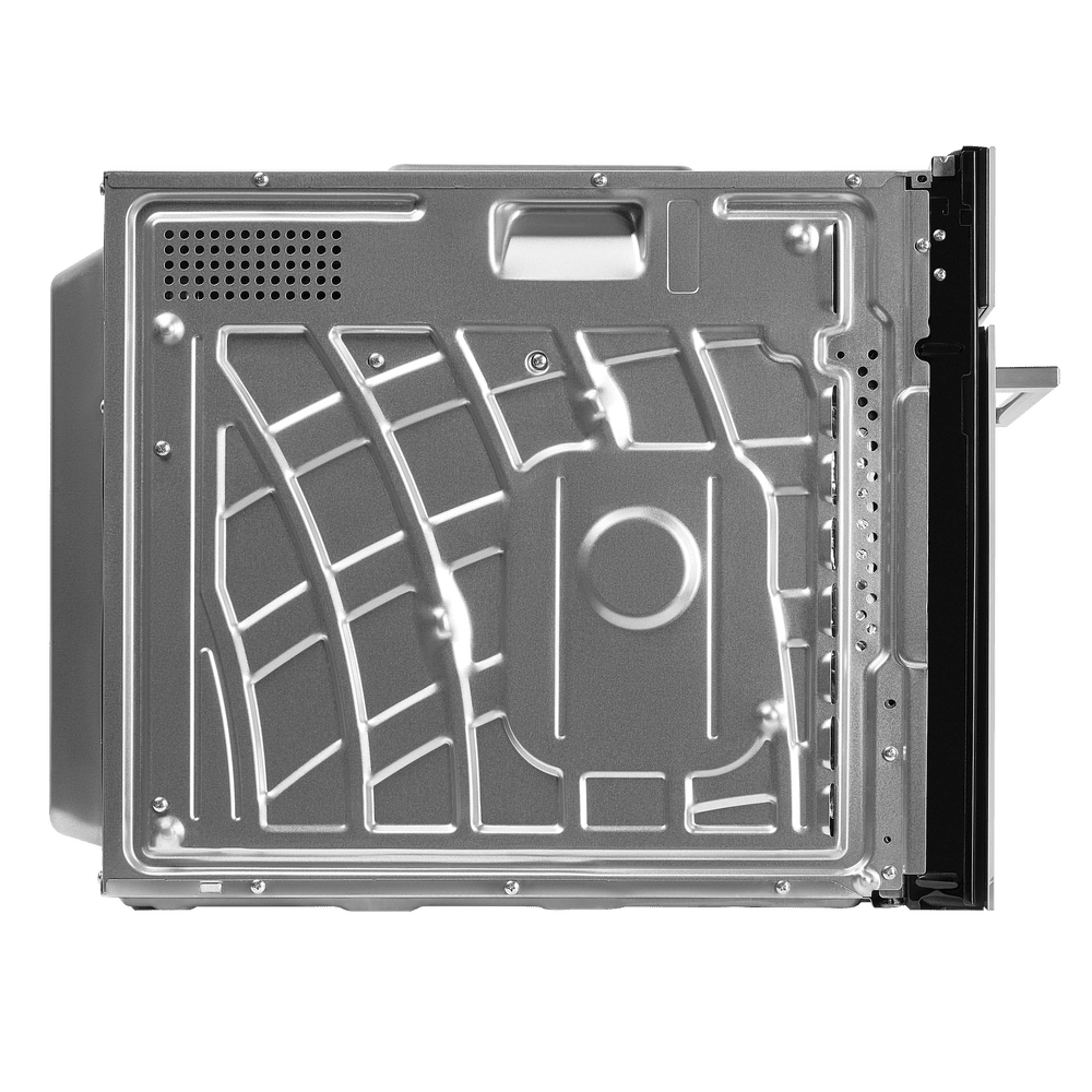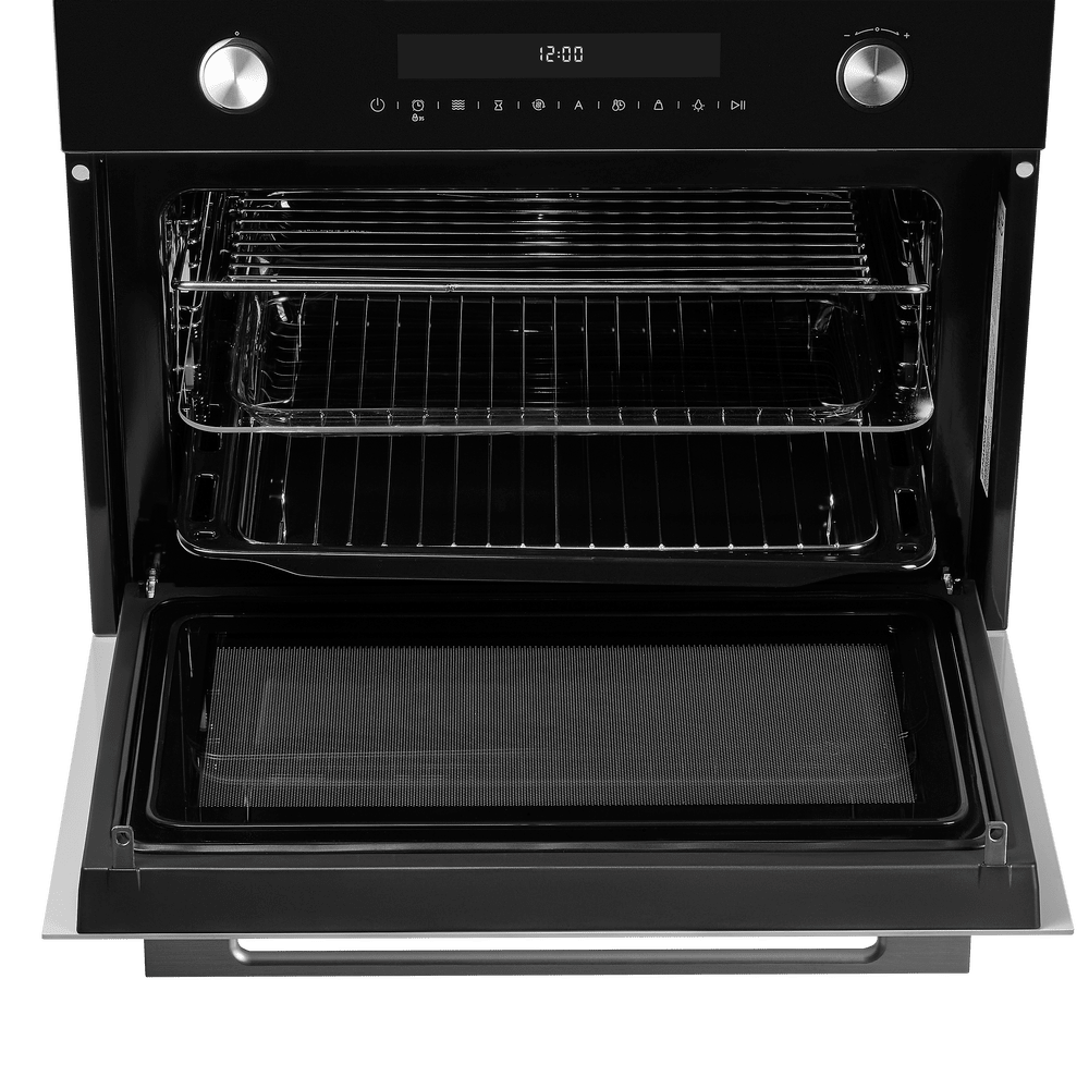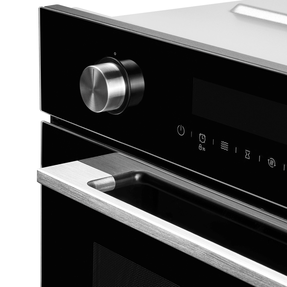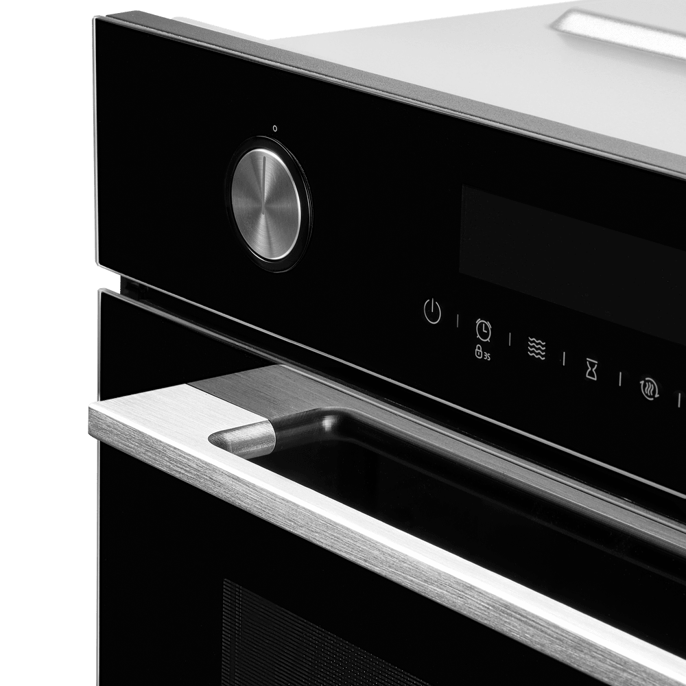 Панель управления сочетает сенсорные кнопки и утапливаемые поворотные регуляторы, а дисплей показывает время и выбранные параметры. Таймер и часы упрощают планирование приготовления, автоматическое отключение завершает работу по таймеру, а блокировка настроек от детей добавляет безопасность. Тангенциальная система охлаждения и тройное стекло в дверце с функцией «холодной двери» сохраняют фронт комфортным на ощупь, устраняют риск случайных ожогов и защищают мебель рядом с прибором.