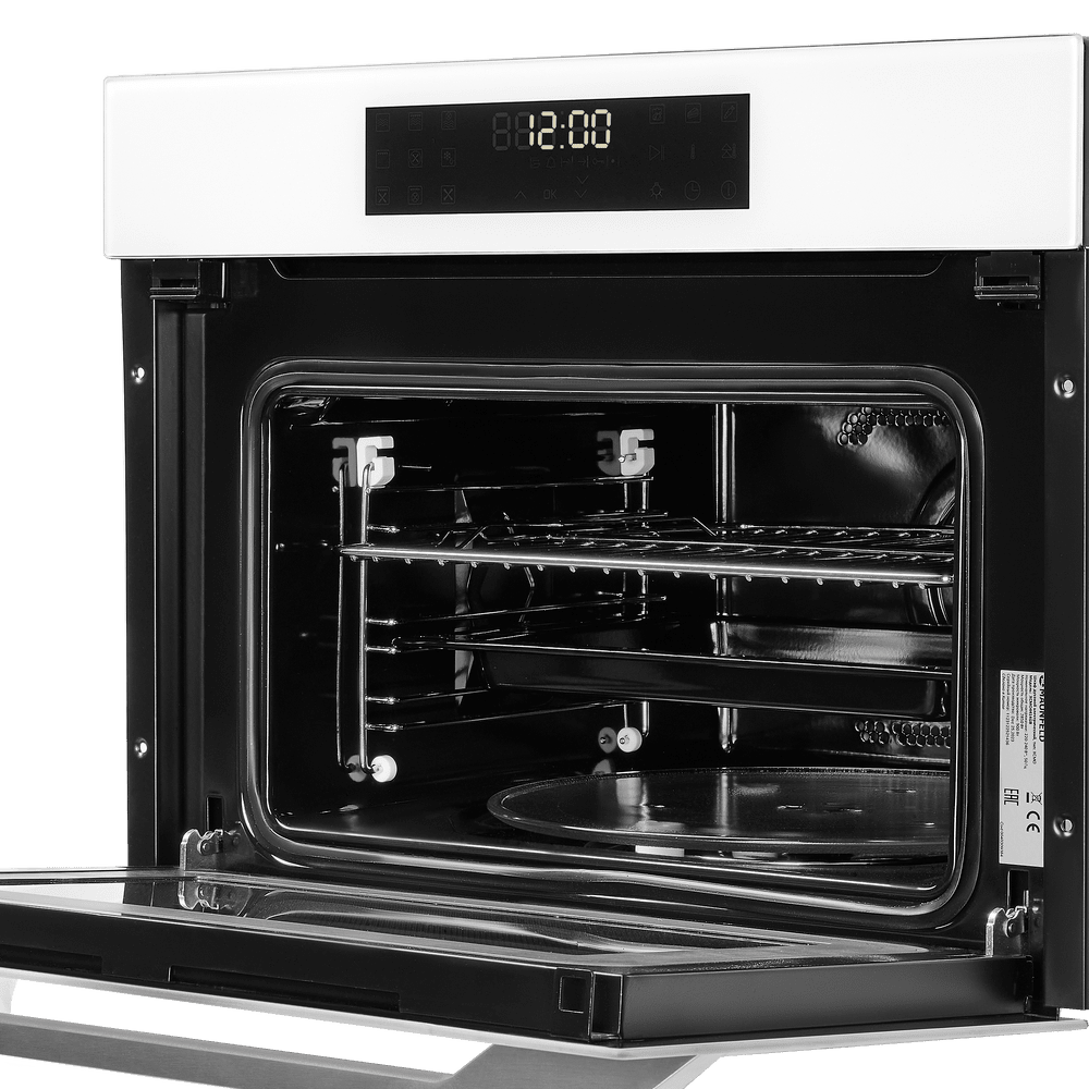 Габариты 45.5×59.5×57 см и рекомендованные размеры ниши 45.8×56.4×57 см позволяют легко встроить прибор в мебельный модуль. Объем камеры 44 литра и три уровня приготовления дают достаточно простора для приготовления объемных блюд. Модель оснащена 9 режимами нагрева и 3 автоматическими программами, что облегчает подбор параметров для различных блюд. Верхний и нижний нагрев подходят для классической выпечки, а конвекция с кольцевым нагревом обеспечивает равномерное распределение температуры. Наличие гриля помогает быстро получить румяную корочку.