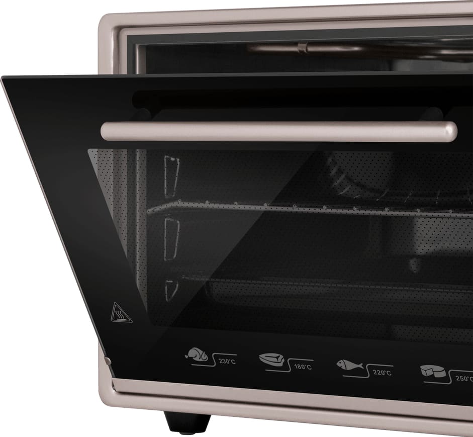 Устройство предлагает семь режимов работы: верхний, нижний нагрев, их сочетание и конвекцию, а также электрический гриль. Комбинация верхнего и нижнего нагрева с конвекцией расширяет возможности приготовления и обеспечивает равномерную корочку. Диапазон температур от 50 до 300 °C подходит для выпечки, запекания и приготовления блюд на гриле. Таймер со звуковым сигналом и автоматическим отключением контролирует процесс и предотвращает передержку.