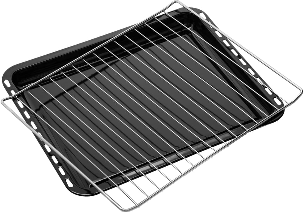 В стандартную комплектацию любого духового шкафа входят один или два противня — эмалированных или с антипригарным покрытием — и решетка. Единственный противень, как правило, имеет низкие бортики и предназначается для приготовления выпечки. Если духовка комплектуется двумя противнями, то второй отличается более высокими бортиками — его можно использовать для запекания мяса, птицы, овощных блюд. На решетке в духовке, не оснащенной грилем, обычно устанавливаются формы для запекания — стальные, керамические или стеклянные. В духовках премиум-класса количество противней может быть увеличено: к стандартному комплекту добавляются противни с перфорацией для мяса, специальные поддоны для сбора выделившегося сока.