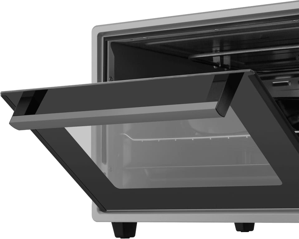 Пять программ охватывают типовые задачи: верхний, нижний, совместный верхний + нижний нагрев, конвекция, а также расширенные комбинации — нагрев снизу с вентилятором и работа верхнего и нижнего нагрева вместе с конвекцией. Вентилятор равномерно распределяет поток воздуха по камере, помогая добиться стабильного результата по всей площади противня. Раздельные верхний и нижний нагрев удобны, когда нужно подсушить основу либо усилить нагрев сверху для румяной корочки, а режимы с конвекцией ускоряют обмен горячего воздуха внутри камеры.