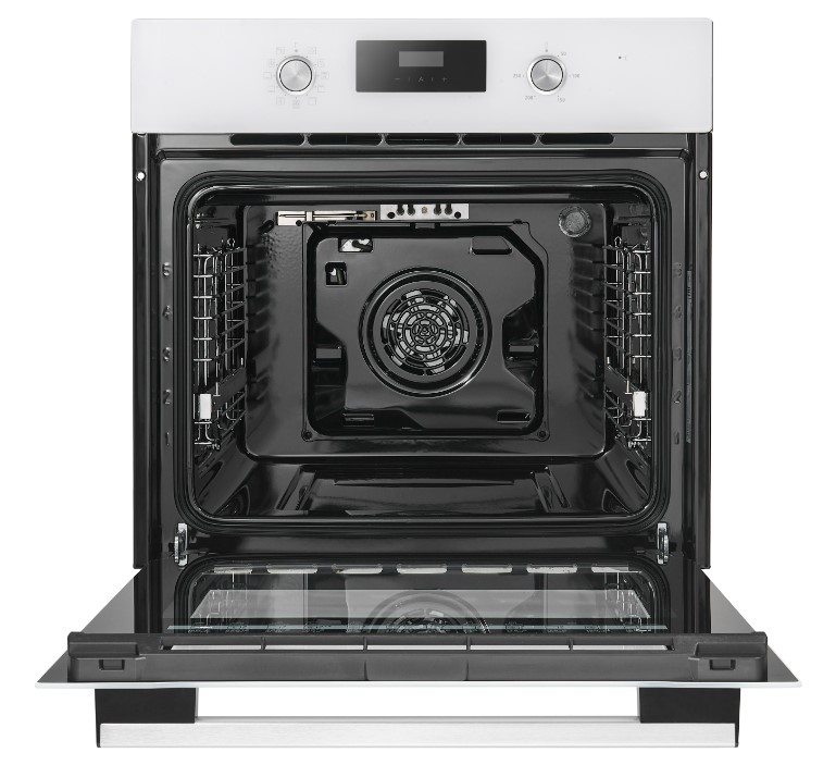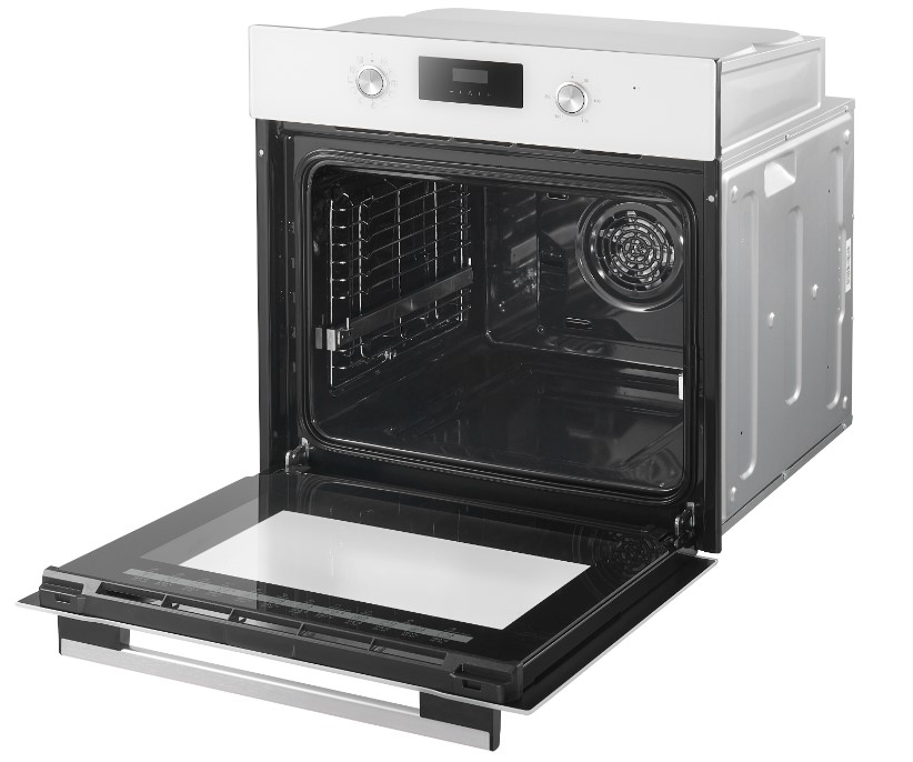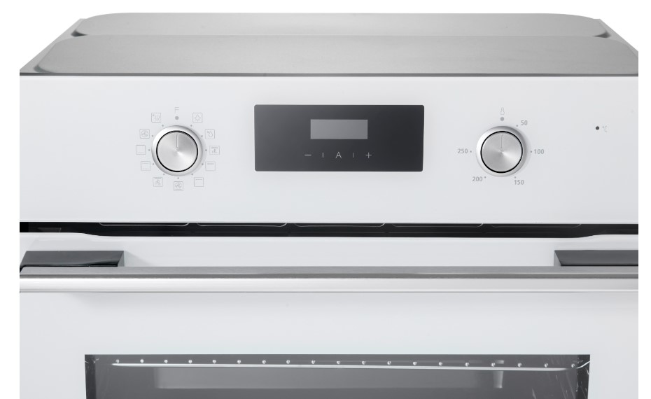 Особенности дизайна и внешней панели управления — также важный пункт при выборе духовки на кухню. В данной модели нужно обратить внимание на цвет — белый,
