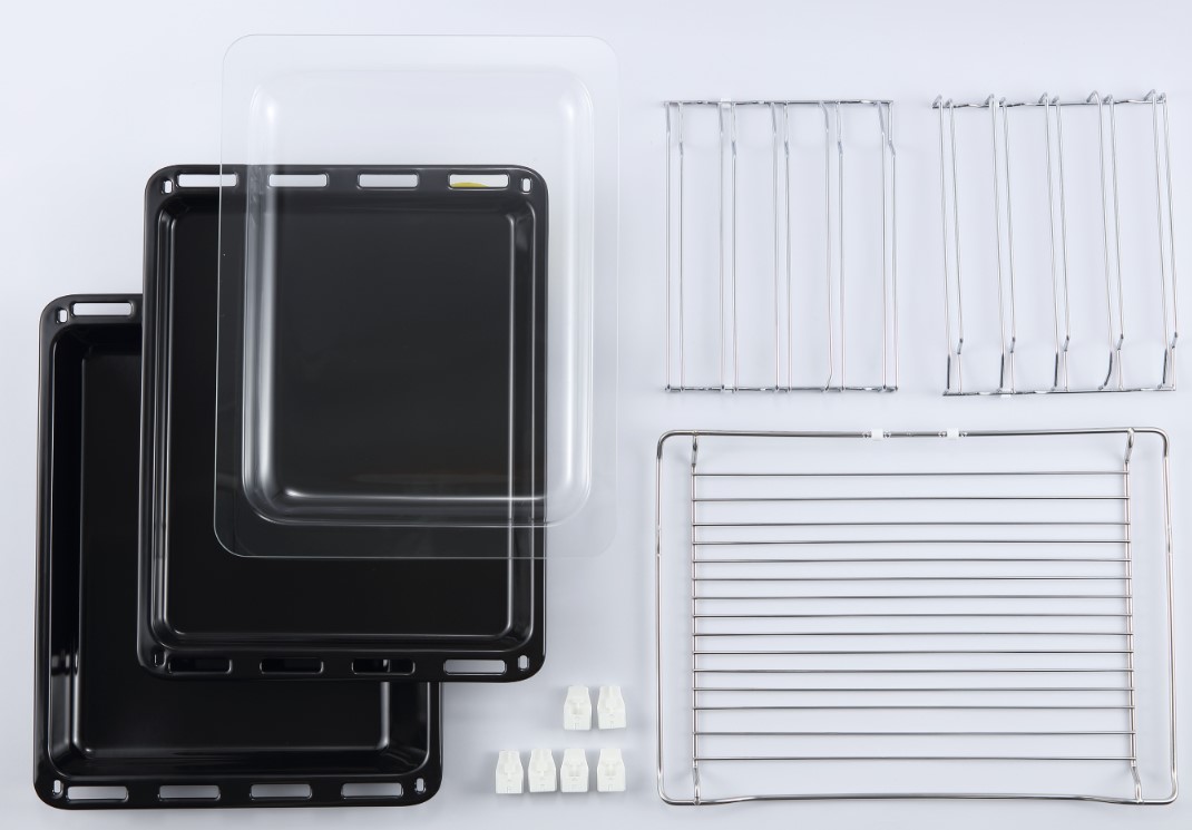 В стандартную комплектацию любого духового шкафа входят один или два противня — эмалированных или с антипригарным покрытием — и решетка. Единственный противень, как правило, имеет низкие бортики и предназначается для приготовления выпечки. Если духовка комплектуется двумя противнями, то второй отличается более высокими бортиками — его можно использовать для запекания мяса, птицы, овощных блюд. На решетке в духовке, не оснащенной грилем, обычно устанавливаются формы для запекания — стальные, керамические или стеклянные. В духовках премиум-класса количество противней может быть увеличено: к стандартному комплекту добавляются противни с перфорацией для мяса, специальные поддоны для сбора выделившегося сока.