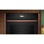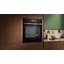 Выглядит как встроенный электрический прибор черного цвета с лаконичной передней панелью Flex Design и откидной дверцей, оснащённой доводчиком. Сенсорные кнопки и TFT-дисплей создают гладкую поверхность управления, часы — электронные, отображение настроек понятное. Корпус рассчитан на встраивание в нишу размеров 58.5-59.5 × 56-56.8 × 55 см, габариты самой печи 59.5×59.6×54.8 см.