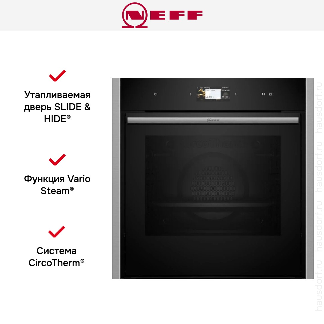 Готовьте свои лучшие блюда и пробуйте новые рецепты с духовым шкафом Neff B64VS71N0! Стандартные размеры и большой объем внутренней камеры — выбор тех, кто много готовит для семьи или частых праздничных встреч с друзьями. Желательно заранее продумать расположение такой модели в кухонном гарнитуре.