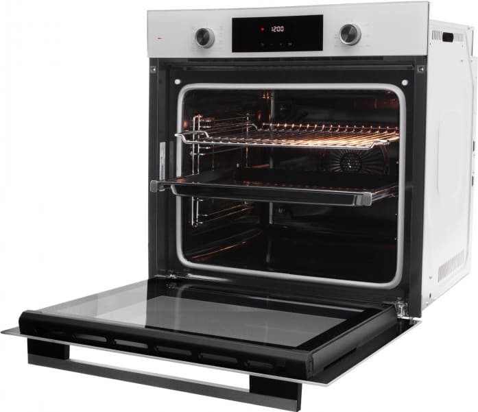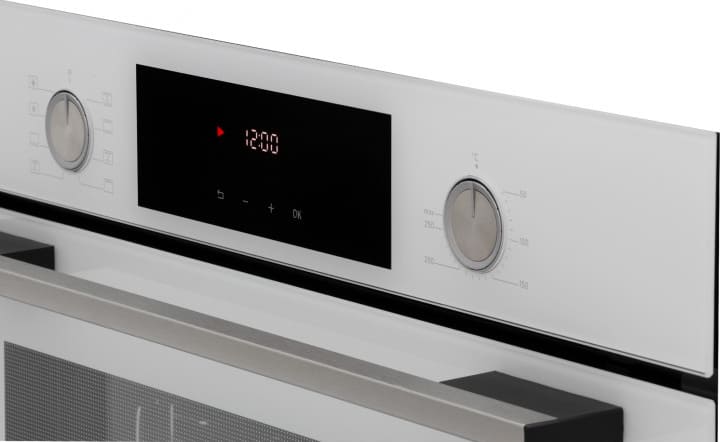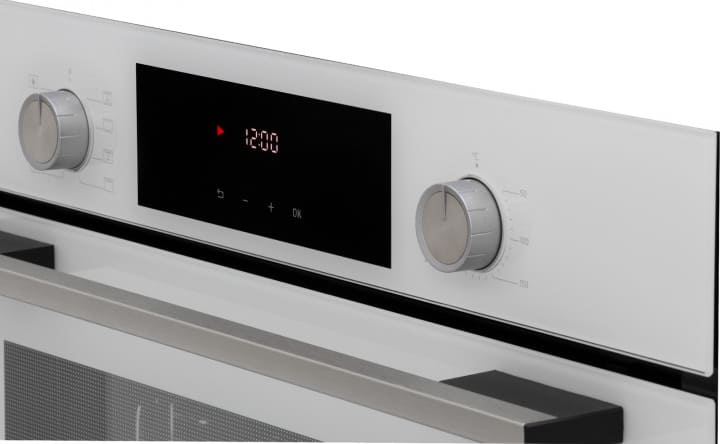 Особенности дизайна и внешней панели управления — также важный пункт при выборе духовки на кухню. В данной модели нужно обратить внимание на цвет — белый,