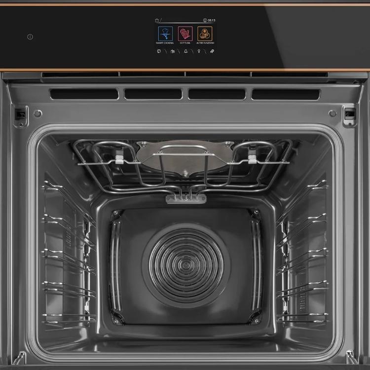 Быстрый предварительный нагрев обеспечивается совместным использованием встроенного вентилятора и кольцевого нагревательного элемента, размещенного на задней стенке камеры. Горячий воздух попадает в камеру сквозь специальную систему отверстий, расположенных там же, на задней стенке: благодаря им он проникает во все уголки камеры, равномерно обволакивая продукты на всех уровнях приготовления. В духовках «Смег» распределение воздуха улучшается также за счет особой формы камеры.