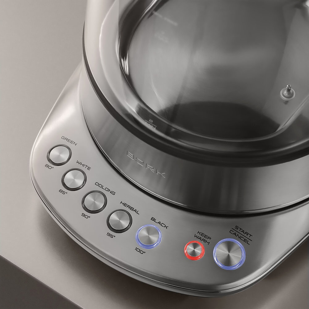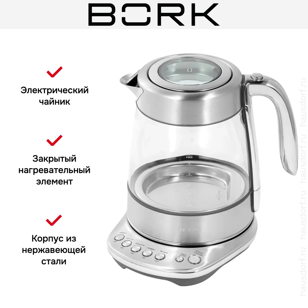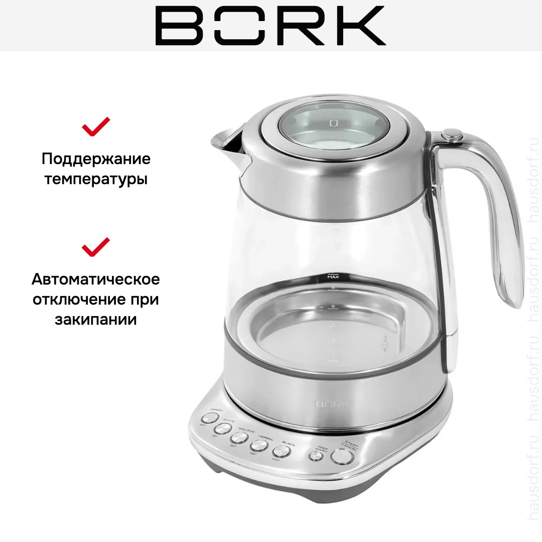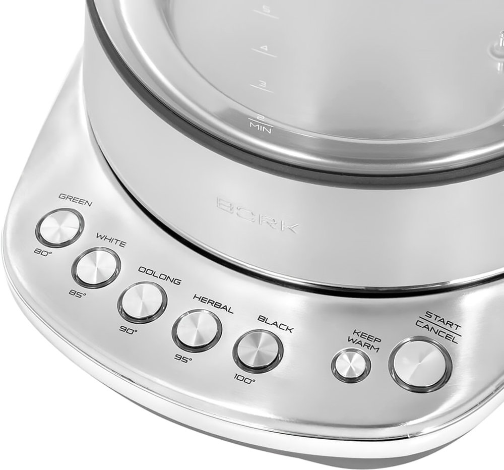 Функция поддержания заданной температуры Keep Warm для электрических чайников Bork позволяет сохранять температуру воды с точностью до градуса в течение 60 минут. Это поможет использовать приготовленный напиток длительное время без повторного кипячения в оптимальном диапазоне для заваривания чая.