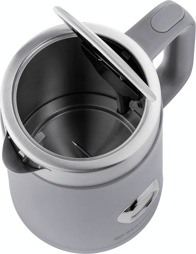Управление механическое, с удобной кнопкой включения сбоку корпуса, что делает запуск простым и предсказуемым. Подставка с поворотом на 360° обеспечивает свободу расположения и удобство при подаче напитка правой или левой рукой. Прибор оснащён автоматическим отключением при закипании, при снятии с базы и при перегреве, а также блокировкой включения без воды, что минимизирует риск ошибок и продлевает срок службы.
