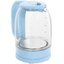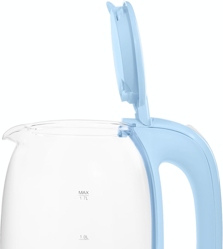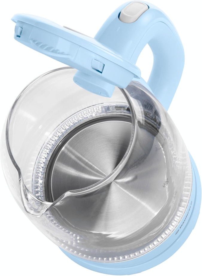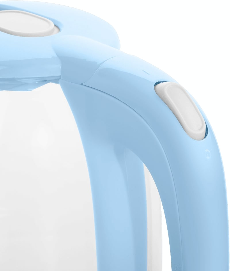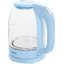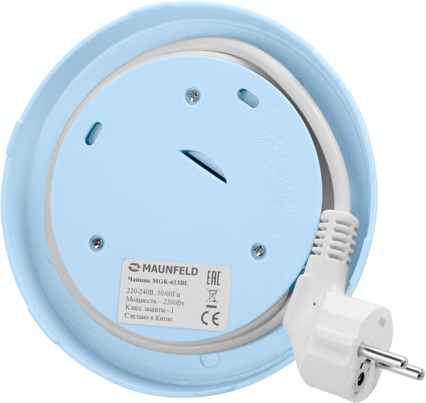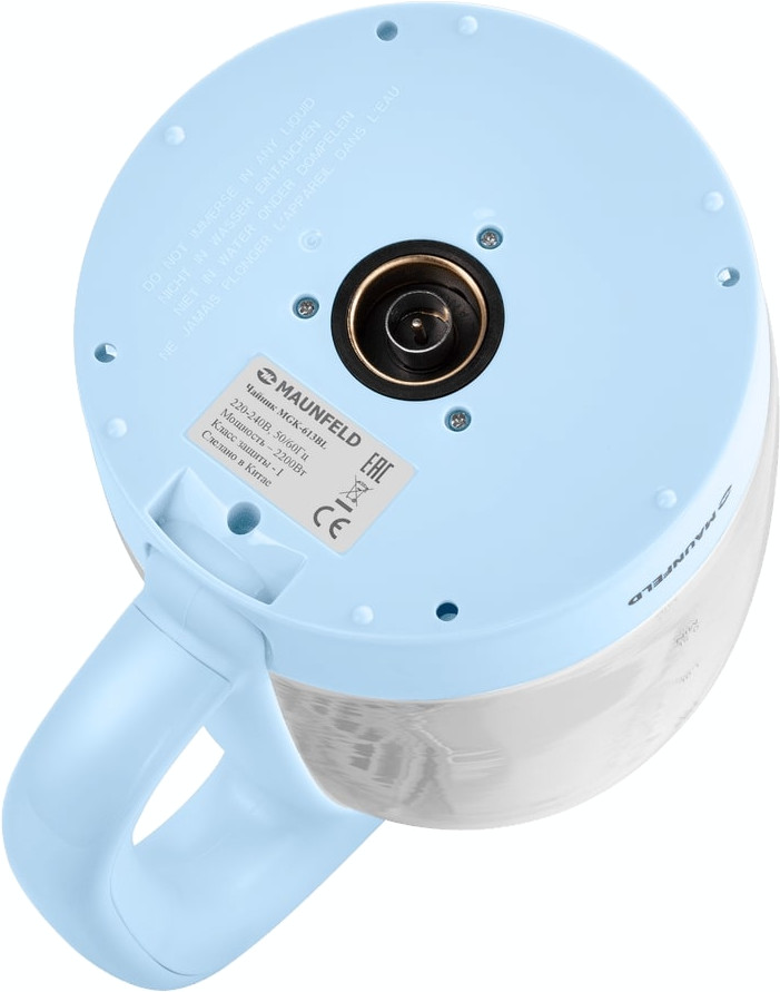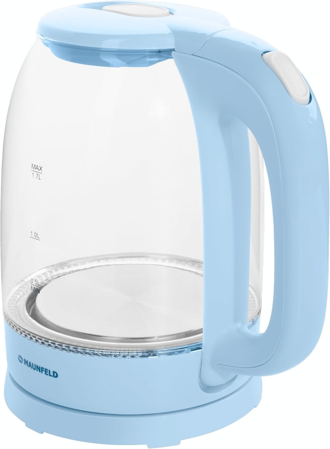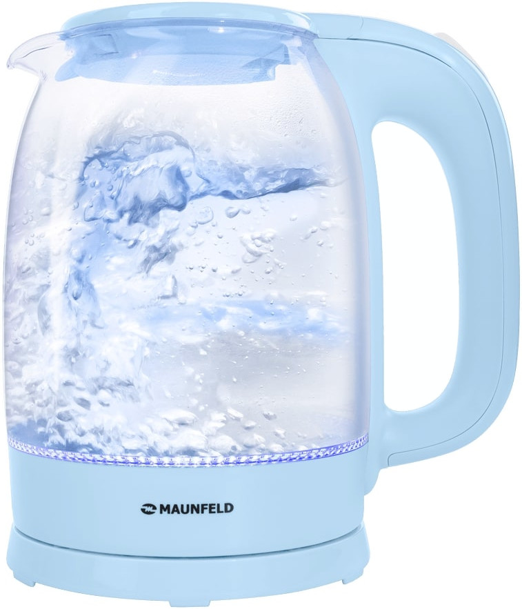 Электрочайник Maunfeld MGK-613BL выполнен в современном голубом исполнении с прозрачной стеклянной колбой и аккуратными пластиковыми вставками. Внешний облик сочетает легкость и функциональность, что делает прибор заметным, но ненавязчивым акцентом на кухне. Подсветка корпуса не только украшает интерьер, но и сразу показывает состояние работы.