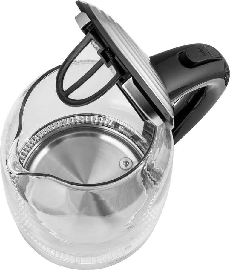 Корпус сочетает лёгкость и прочность: пластик оправдан в элементах, которые не контактируют с водой, а стеклянная колба отвечает за чистоту вкуса. Закрытый нагревательный элемент минимизирует образование накипи на дне и ускоряет нагрев, при этом уход упрощён. Нейлоновый фильтр от накипи защищает напиток от частиц, а шкала уровня воды облегчает дозирование объёма до 1,7 литра.